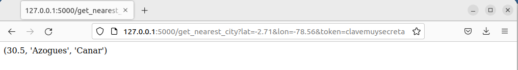 python manage.pyGo to URL: http://127.0.0.1:5000/get_nearest_city?lat=-2.71&lon=-78.56&token=clavemuysecreta
