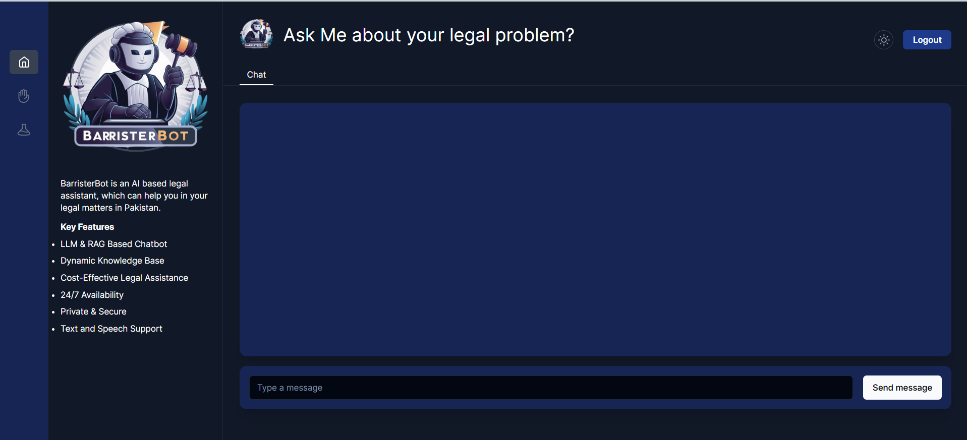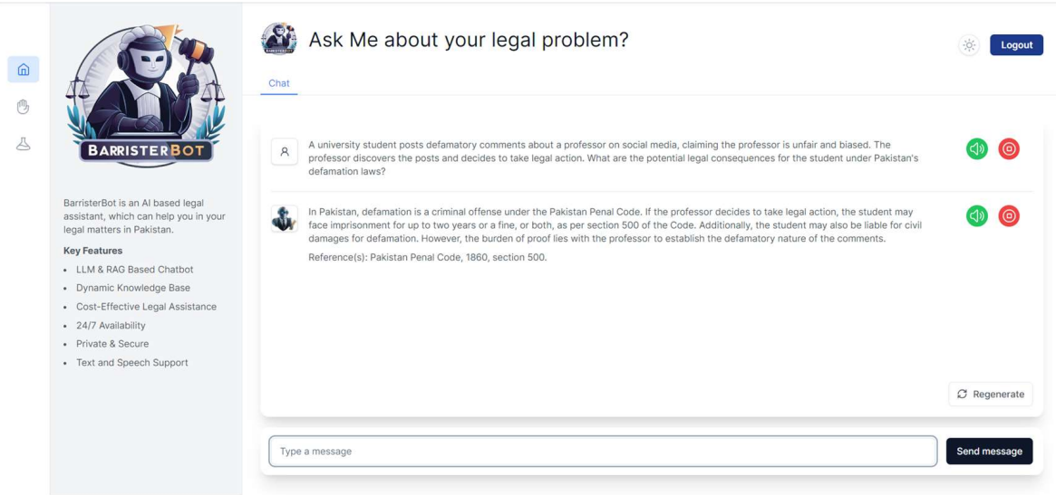 BarristerBot is a Generative AI-based legal chatbot designed to provide personalized legal advice and solutions according to Pakistani law. The system leverages Retrieval-Augmented Generation (RAG) and Large Language Models (LLMs) to deliver accessible, accurate, and context-aware legal guidance.