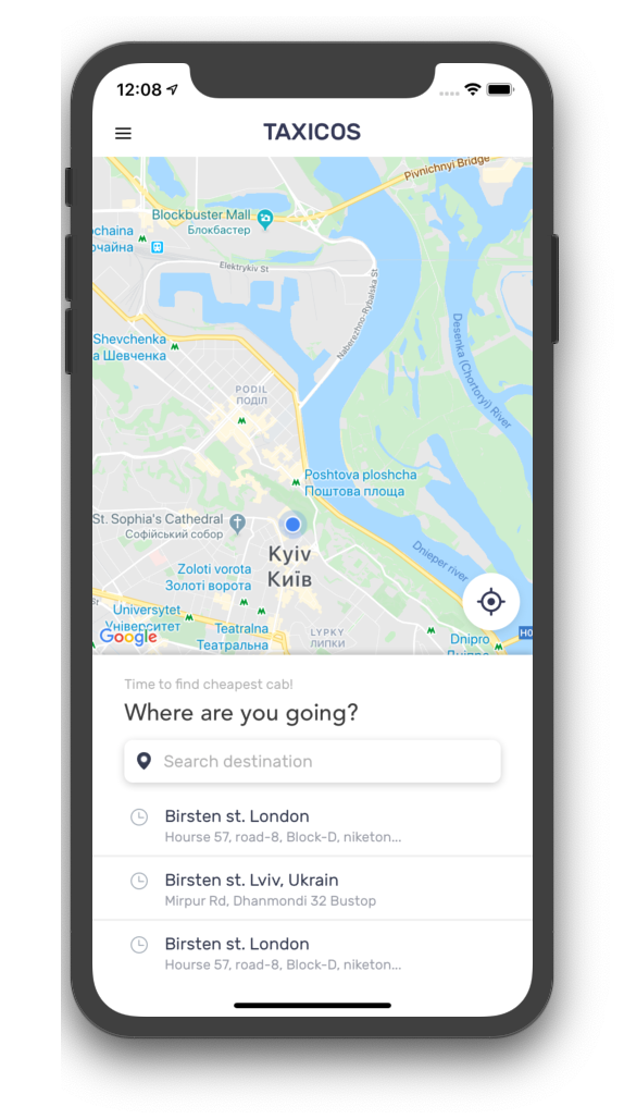 Taxicos-iOS MVVM + RxSwift Main idea: find cheapest cab to specific point. App icon Onboarding Home Side menu Show cabs options Choose location on a map