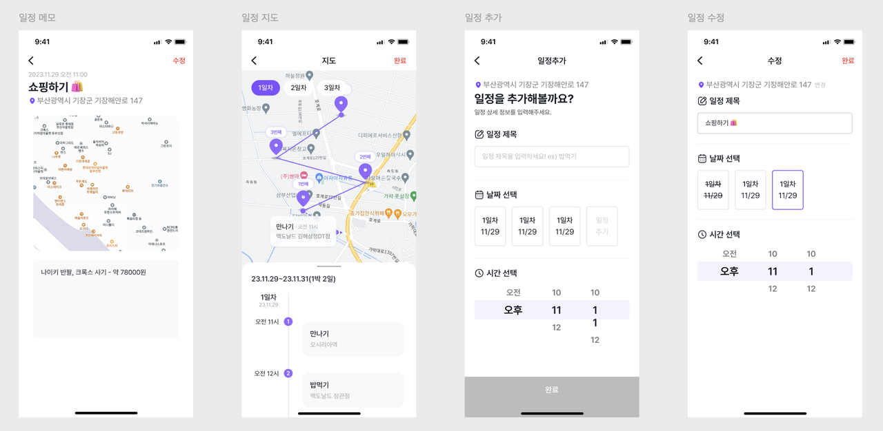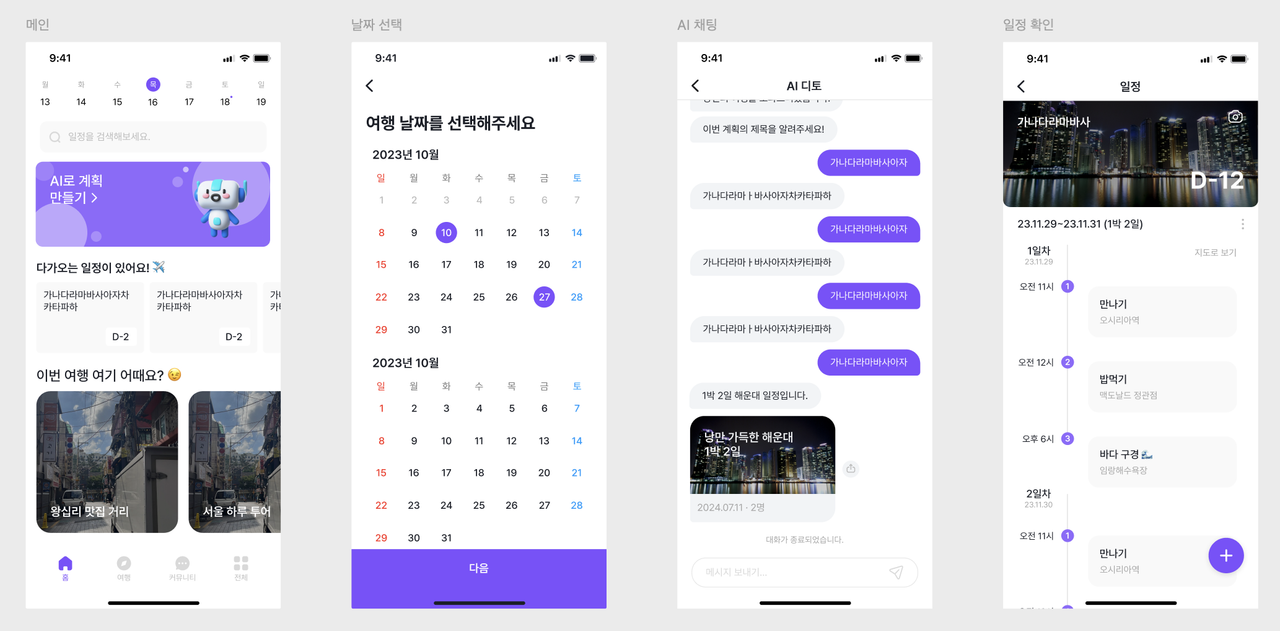 | 홈, 날짜 선택, AI 채팅, 일정 확인 페이지 | 일정 메모, 지도, 일정 추가, 일정 수정 페이지 |