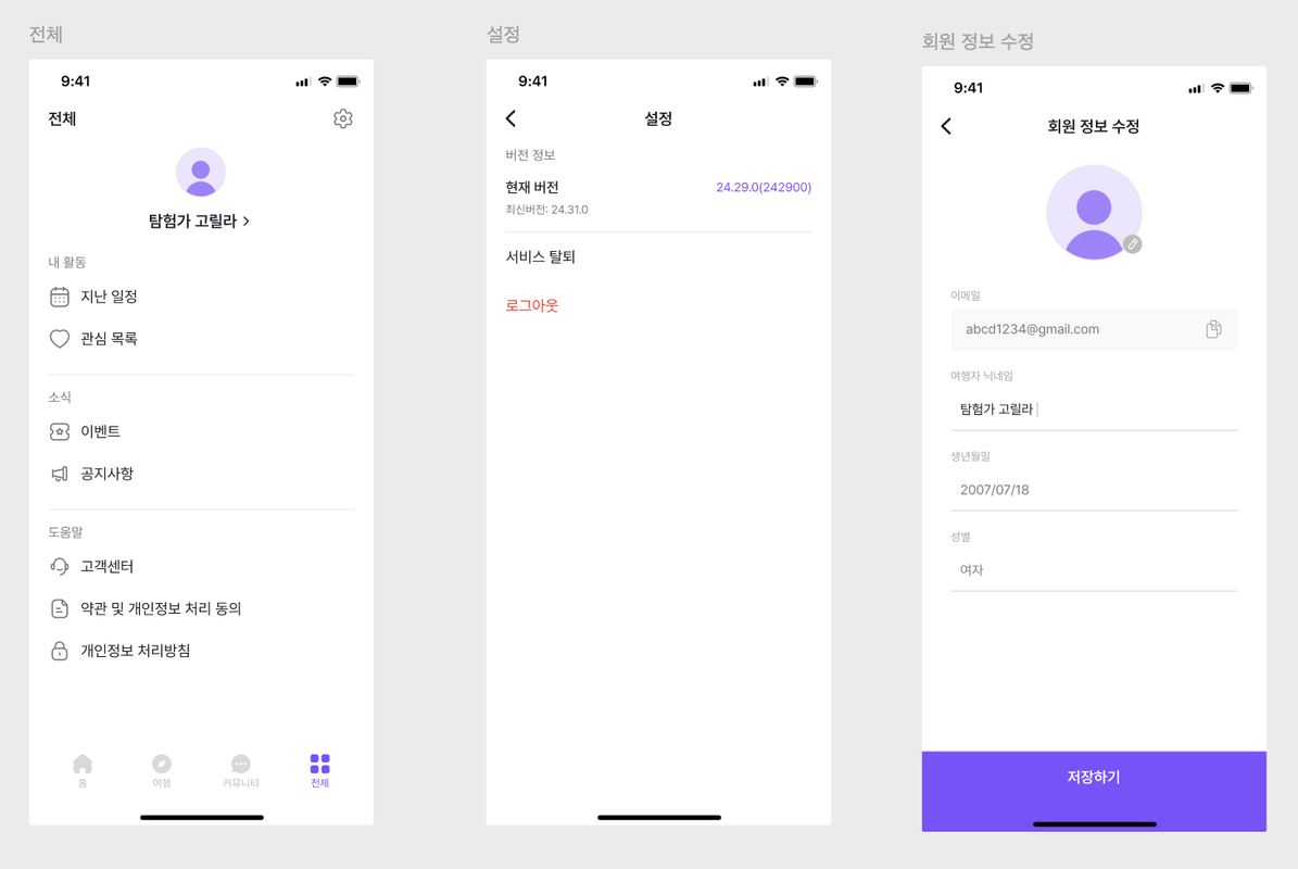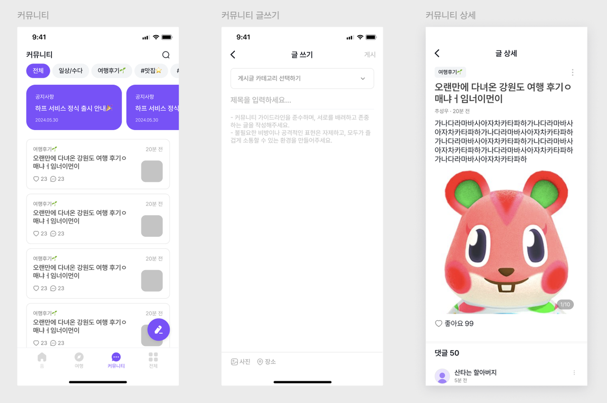 | 커뮤니티, 글 작성, 글 상세 페이지 | 전체, 설정, 유저 프로필 페이지 |