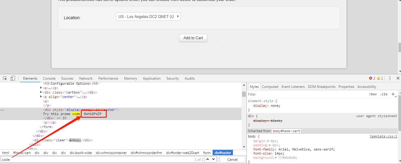 当你进到这个页面的时候呢,别急着点击「Add to Cart」添加到购物车,这里面暗藏着一个优惠码,很多人不知道,使用浏览器查看源代码, chrome浏览器的话按F12,然后搜索「code」,你会发现有一个 「Try this promo code: xxxx 」,这个xxxx就是优惠码,你把他复制下来,待会有用。