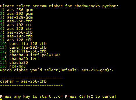 1. 选择加密方式 设置完密码和端口号之后,我们选择加密方式,这里选择 7:
