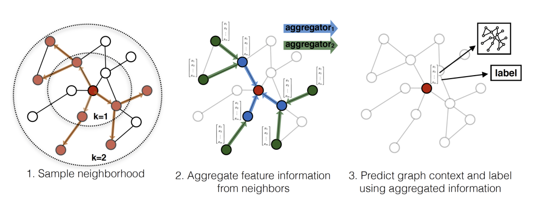 This Graph Neural Network model explores a node's neighbors across connections and aggregates this 'communal' information to understand the content and relationships contained in the graph. See the graphic below: