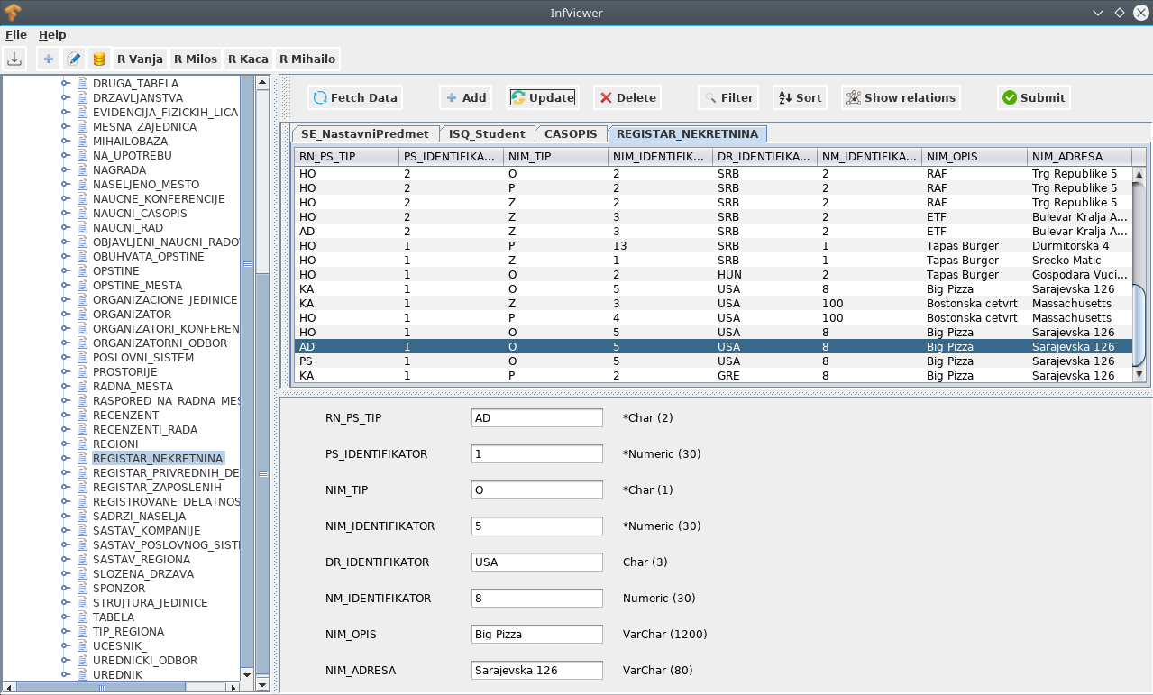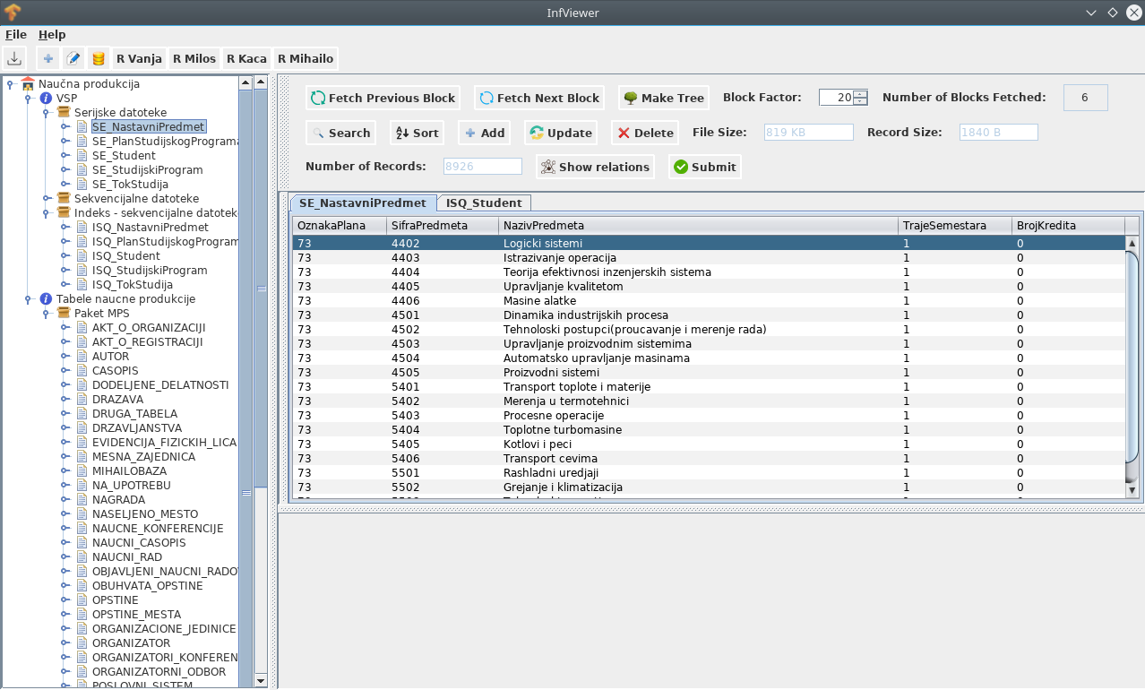 InfViewer is a visualization tool for relational data models with CRUD, search and sort functionalities. It works with serial, sequential, index-sequential and database files. It was a college project for Information Managment course.