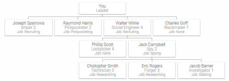 Member recruitment tree system with stats, specializations, tiers, and jobs.