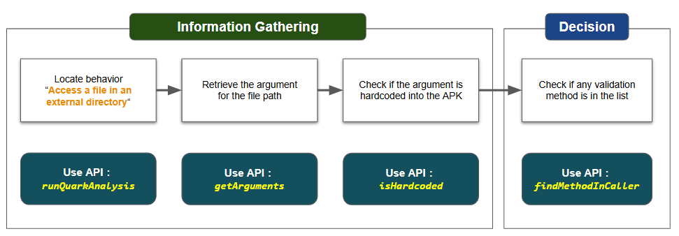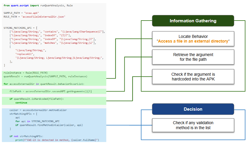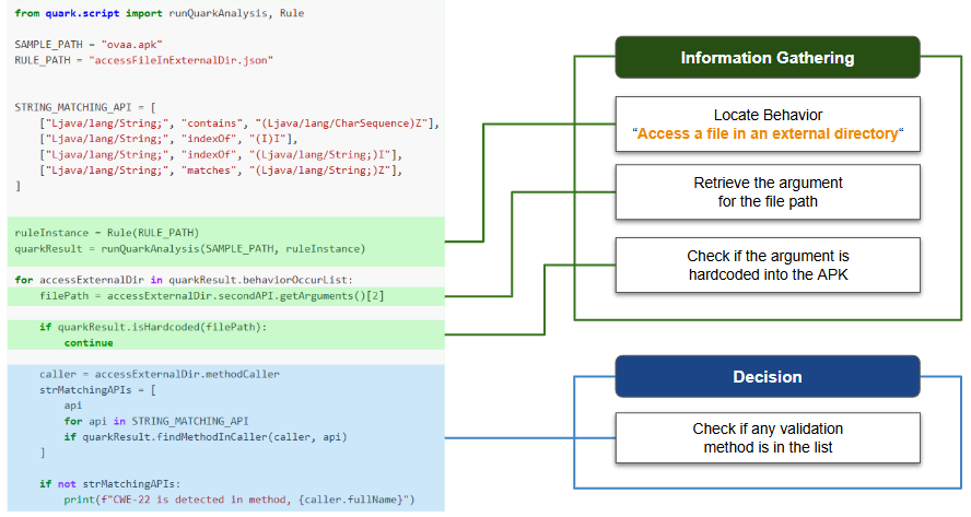 methodInstance.getArguments()to retrieve the file path argument and check whether it belongs to the APK. If it does not belong to the APK, the argument is likely from external input.Then, we use the Quark Script API