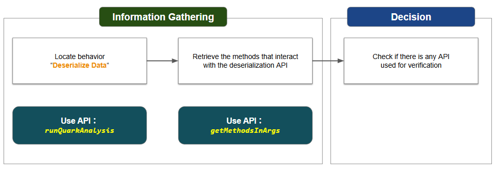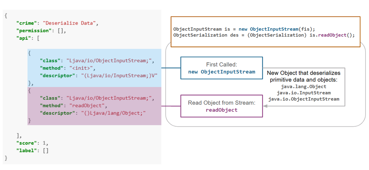 deserializeData.jsonto identify behaviors that deserialize data.Next, we retrieve the methods that interact with the deserialization API. Following this, we check if the methods match any APIs for verifying data.