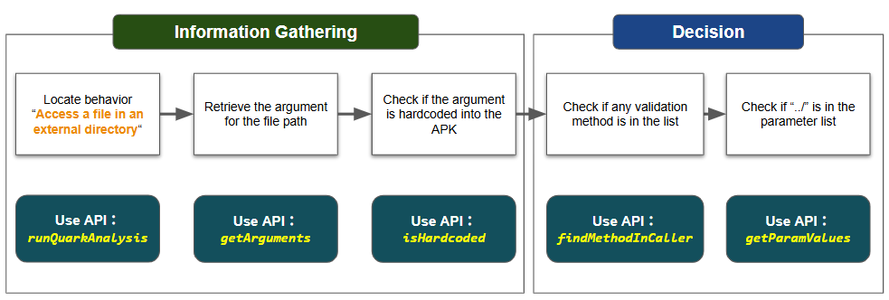 methodInstance.getArguments()to retrieve the file path argument and check whether it belongs to the APK. If it does not belong to the APK, the argument is likely from external input.Finally, we use the Quark Script API
