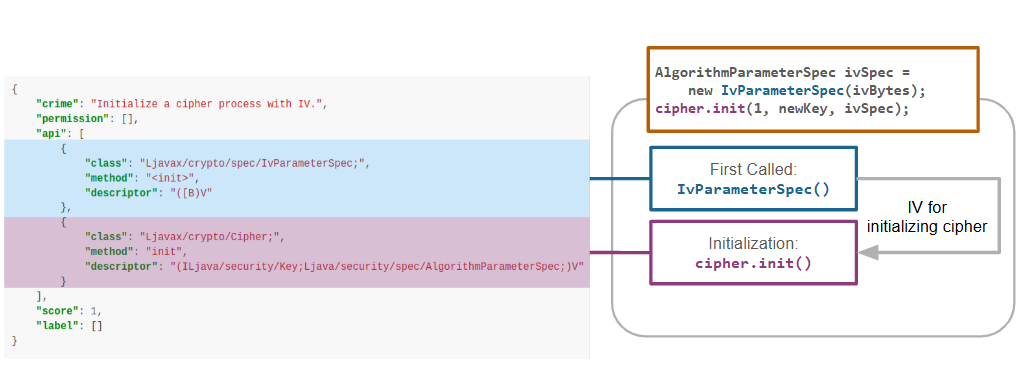 initializeCipherWithIV.jsonto identify behaviors that initialize a cipher object with IV.Then, we use API