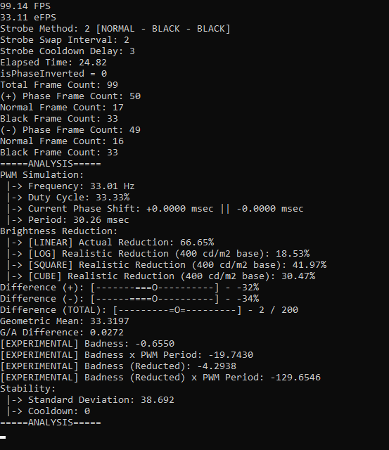 Strobe method = 2, Strobe swap interval = 2, Strobe cooldown delay = 3, FPS = randomly generated in the range of (99, 101)