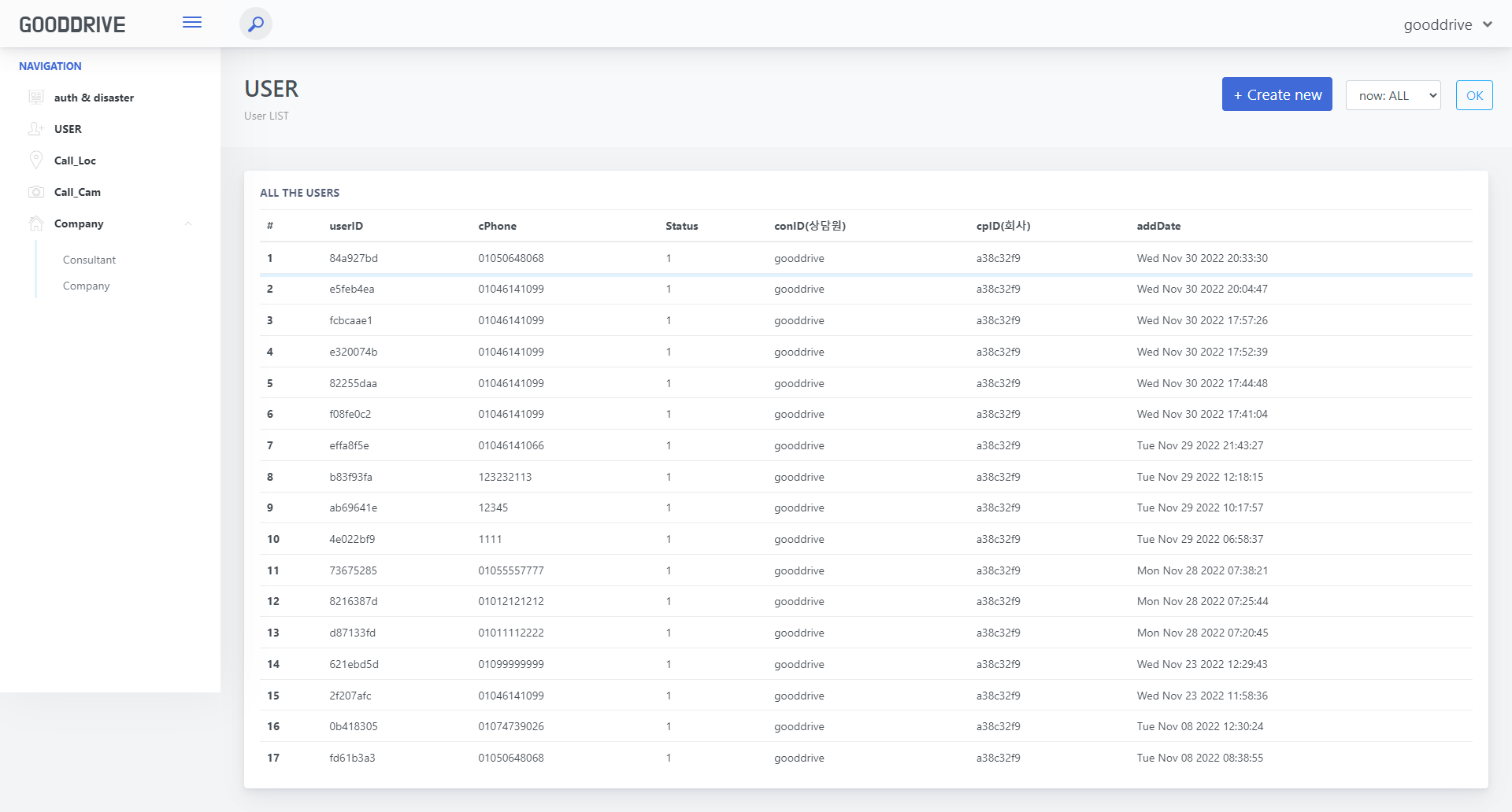 2. userID row 클릭 -> edit 창 노출(call_loc/:id) ➡ 고객 정보 확인 가능