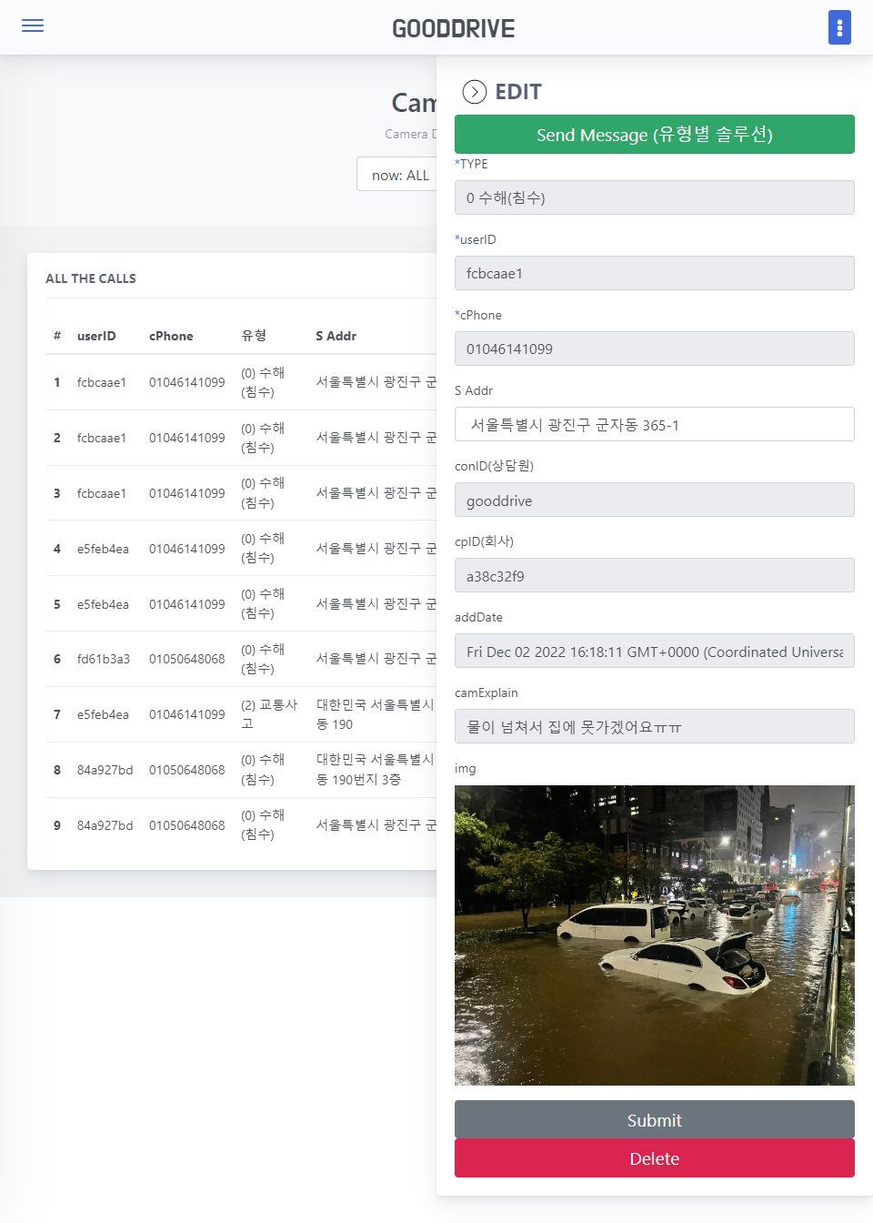: 고객이 "재난 위험 사진 신고" 시 고객 정보 Camera에 들어옴