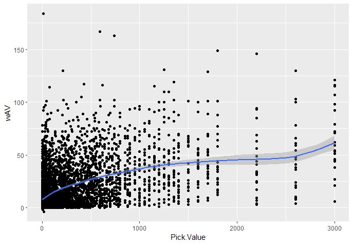 Because the space between picks is not constant, there is a large concentration of players with low value picks. However, the line drawn by R shows there is a increase in Weighted Approximate Value overall as Pick Value increases.