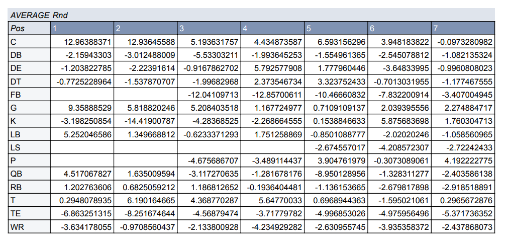 This table shows by round which positions have provided more wAV compared to the expected. For example, the best time to draft a Quarterback is the first round, with second round picks being the only others with a value greater than zero. Kickers and Punters generally perform better selected in the sixth or seventh rounds. Another interesting results is that Guards provide a positive value in every round, while defensive backs are always negative.
