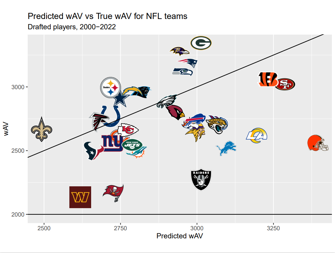 The line is y=x, meaning teams above the line got more value than was expected, while teams below got less. As expected, most teams do not properly utilize their picks based on traditional valuation, but 11 teams still over performed.