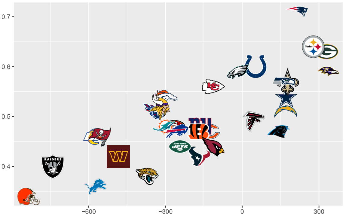 Back in R I used the NFLfastR package to visualize each team's success in drafting compared to how much was expected.