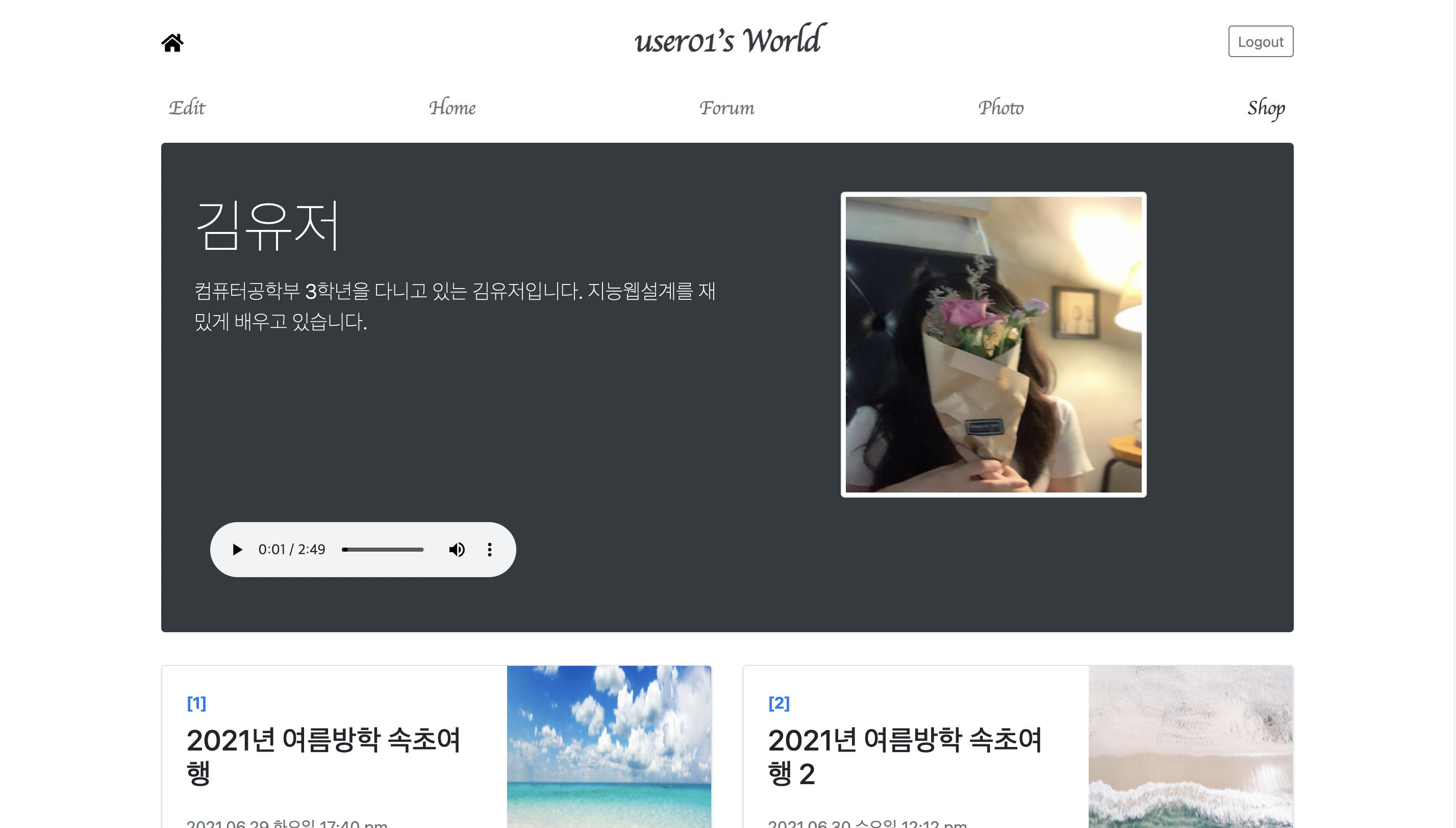 (3-1) home 사용자 프로필 / 사진 글 출력 [로그아웃] && [집 아이콘] -> (initial.jsp로 back) 프로필 음악을 사용하려면 (3-4) shop에서 (2-1)에서 추가한 음악들 구매 후 (3-5)edit 에서 음악 선택