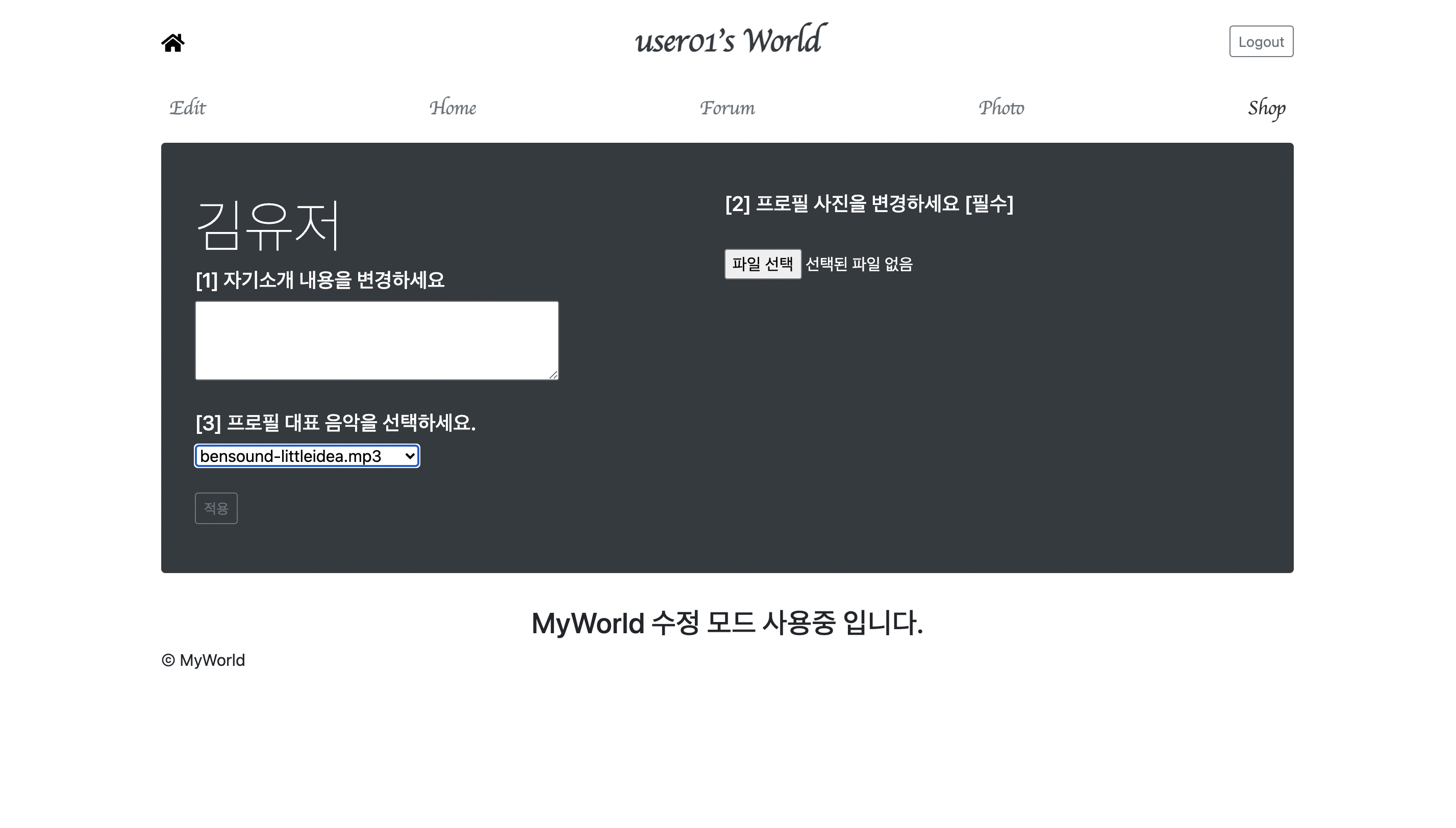 (3-5) edit 사용자 자기소개 / 프로필 사진 / 프로필 음악 변경 [적용] : 프로필 사진과 음악은 변경 필수 / 자기소개는 변경하지 않아도 됨
