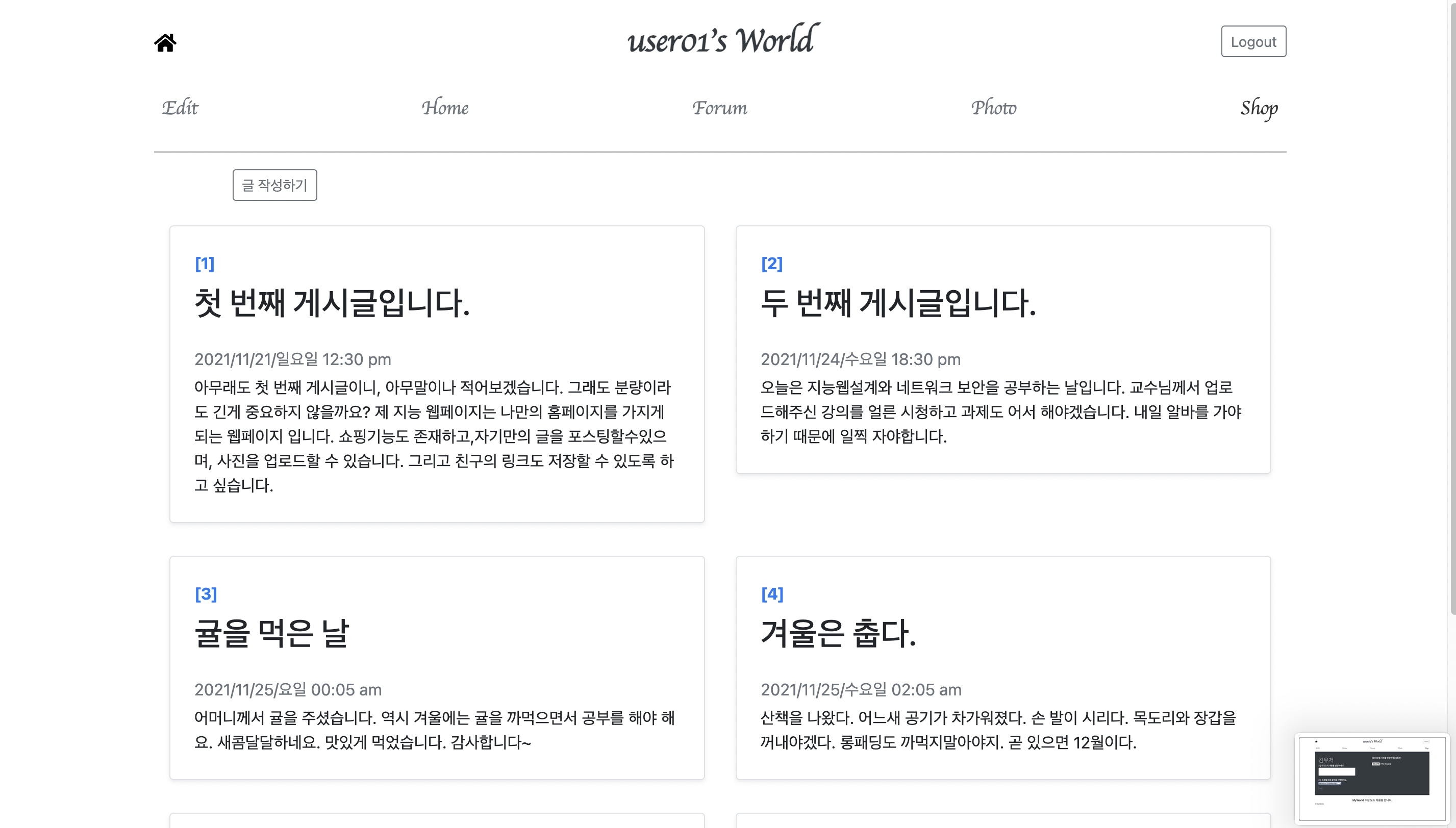 (3) 그 후 사용자의 계정으로 로그인 진행 edit / home / forum / photo / shop 메뉴 있음 ex. korla2 가 로그인 했다면 myWorld_korla2.jsp가 열림 (세션 생성)