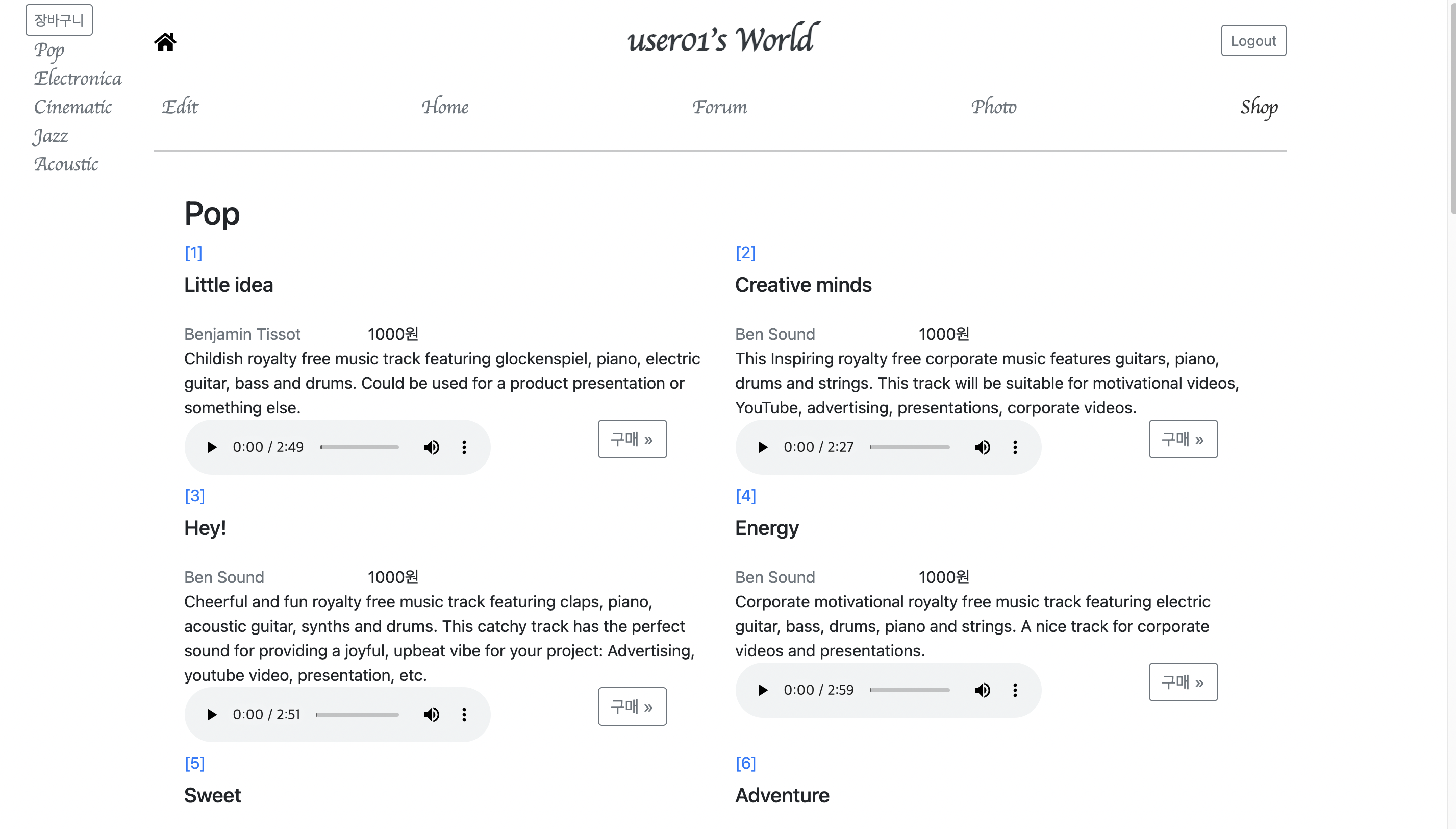 (3-4) shop 등록한 음악 장르별로 출력 ( pop / electronica / cinematic / jazz / acoustic ) 음악 재생 가능 / [ 구매 >> ] -> 사용자 장바구니에 음악 추가 [ 장바구니 ] -> 장바구니로 이동