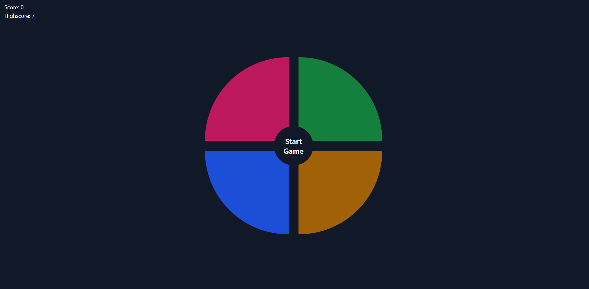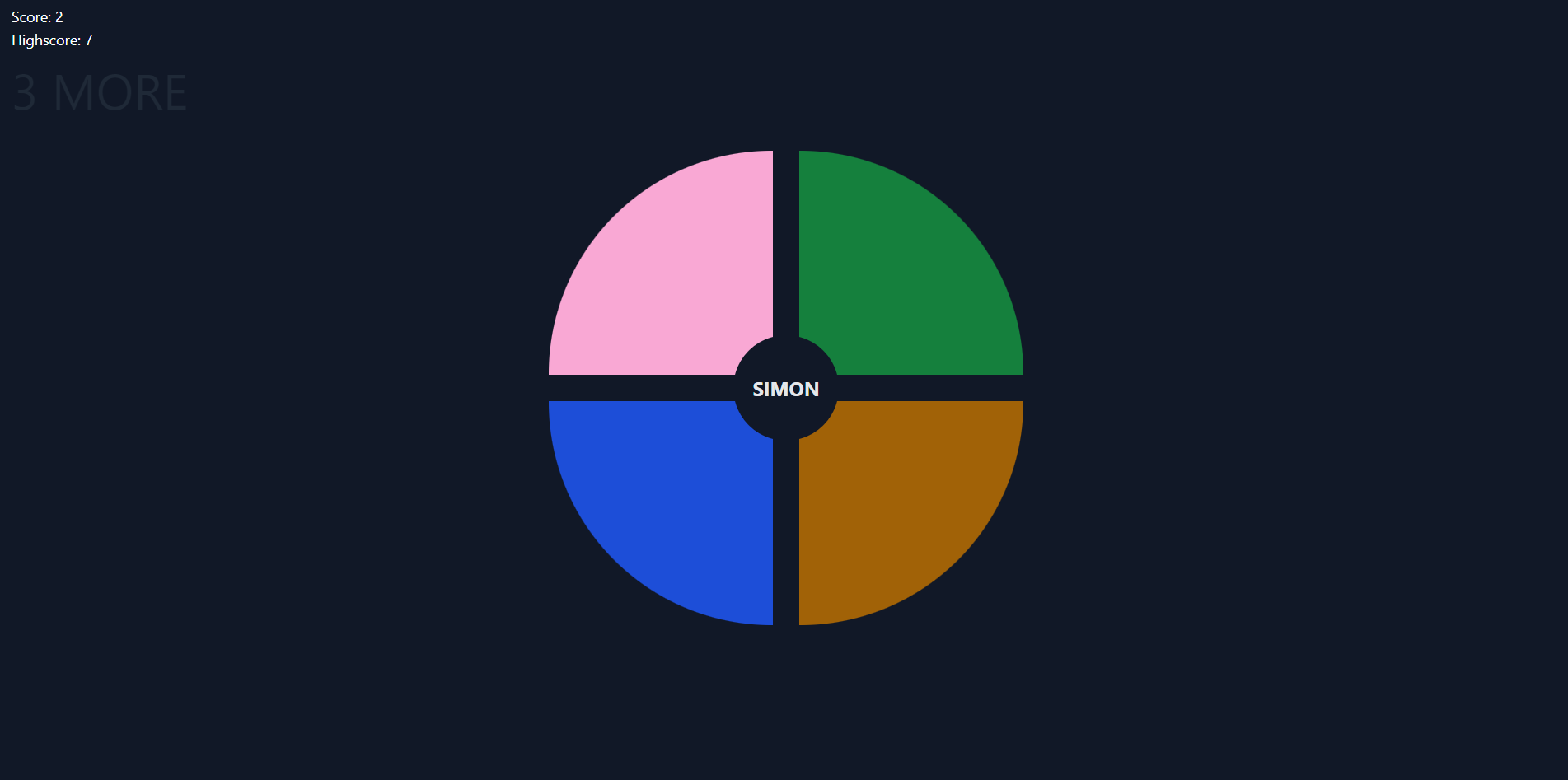 simon play it at: www.playsimon.fun (no longer own url) http://www.playsimon.fun.s3-website-us-east-1.amazonaws.com work practice project competition using react and tailwind sound effects on click / local storage to keep track of highscore