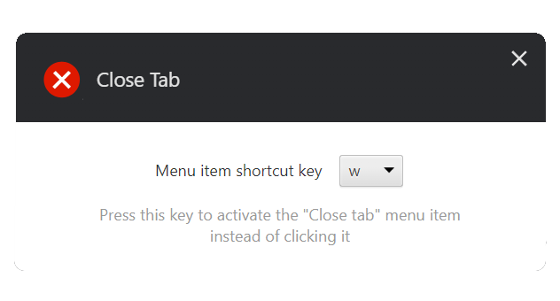 Close Tab lets you close a web page with a right mouse click anywhere on the page followed by a key press. This is often quicker than moving the mouse cursor up to and clicking the tab's close icon or taking your hand off the mouse to use a keyboard shortcut that requires both hands.