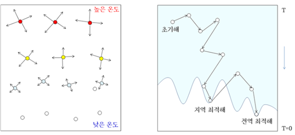 높은 T에서의 초기탐색은 최솟값을 찾는데도 불구하고 확률 개념을 도입하여 현재 해의 이웃해 중에서 현재 해보다 나쁜해로 이동하는 자유로움을 보인다. 그러나 T가 낮아지면서 점차 탐색은 아래방향으로 향하는데 이는 T가 낮아질수록 위방으로 이동하는 확률이 점차 작아진다는 것이다.