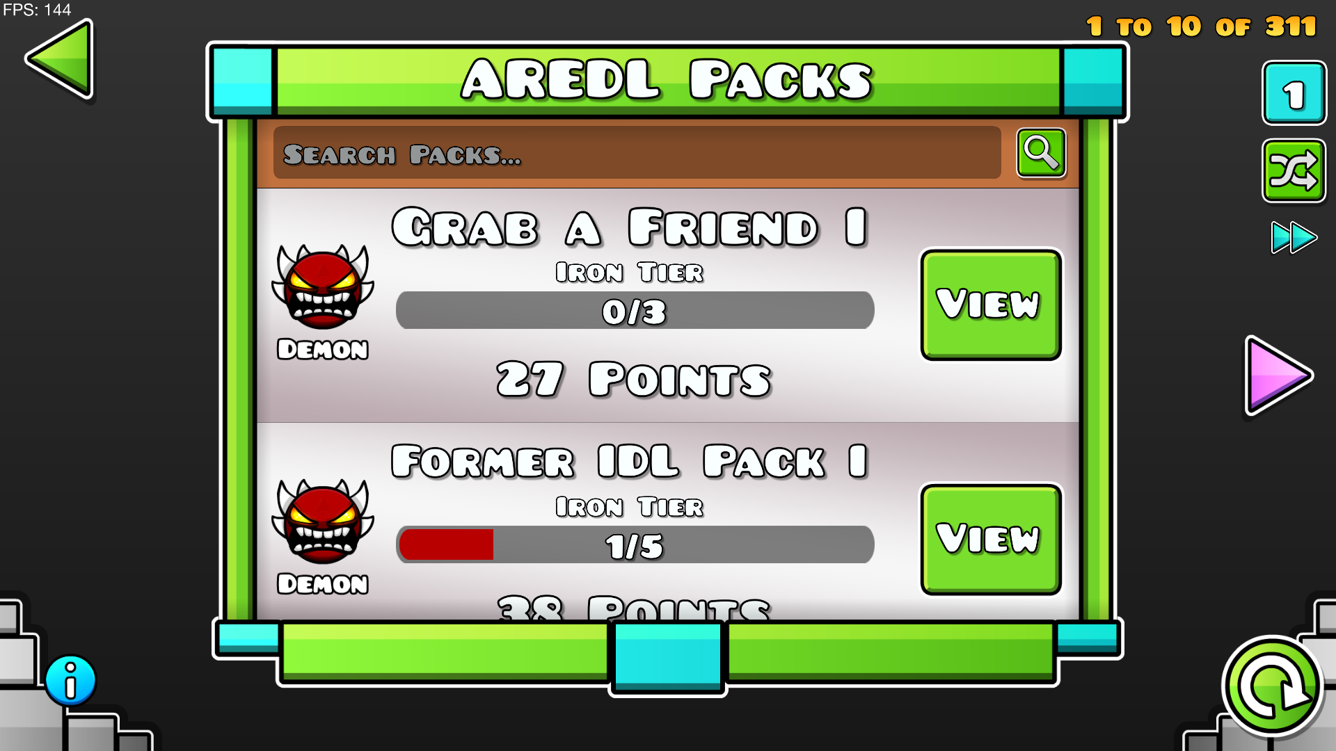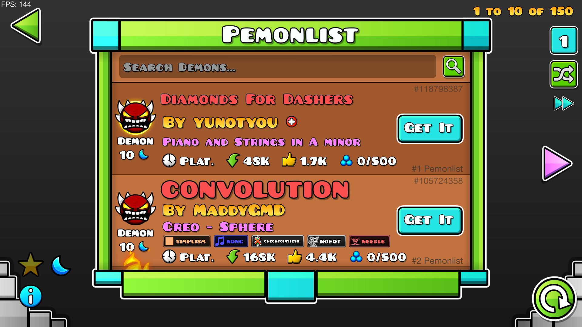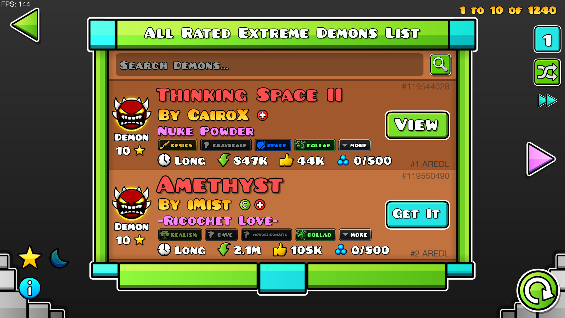 - Buttons that allow you to switch between the AREDL (For classic demons) and the Pemonlist (For platformer demons)