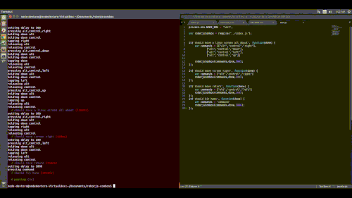 $ npm install robotjs-comboI was trying to do a simple chain of keyboard commands, this one does a quick loop around my workspaces (2X2) in linux using the standard ctrl+alt+arrow. The module takes an array of key combonations executed in order: