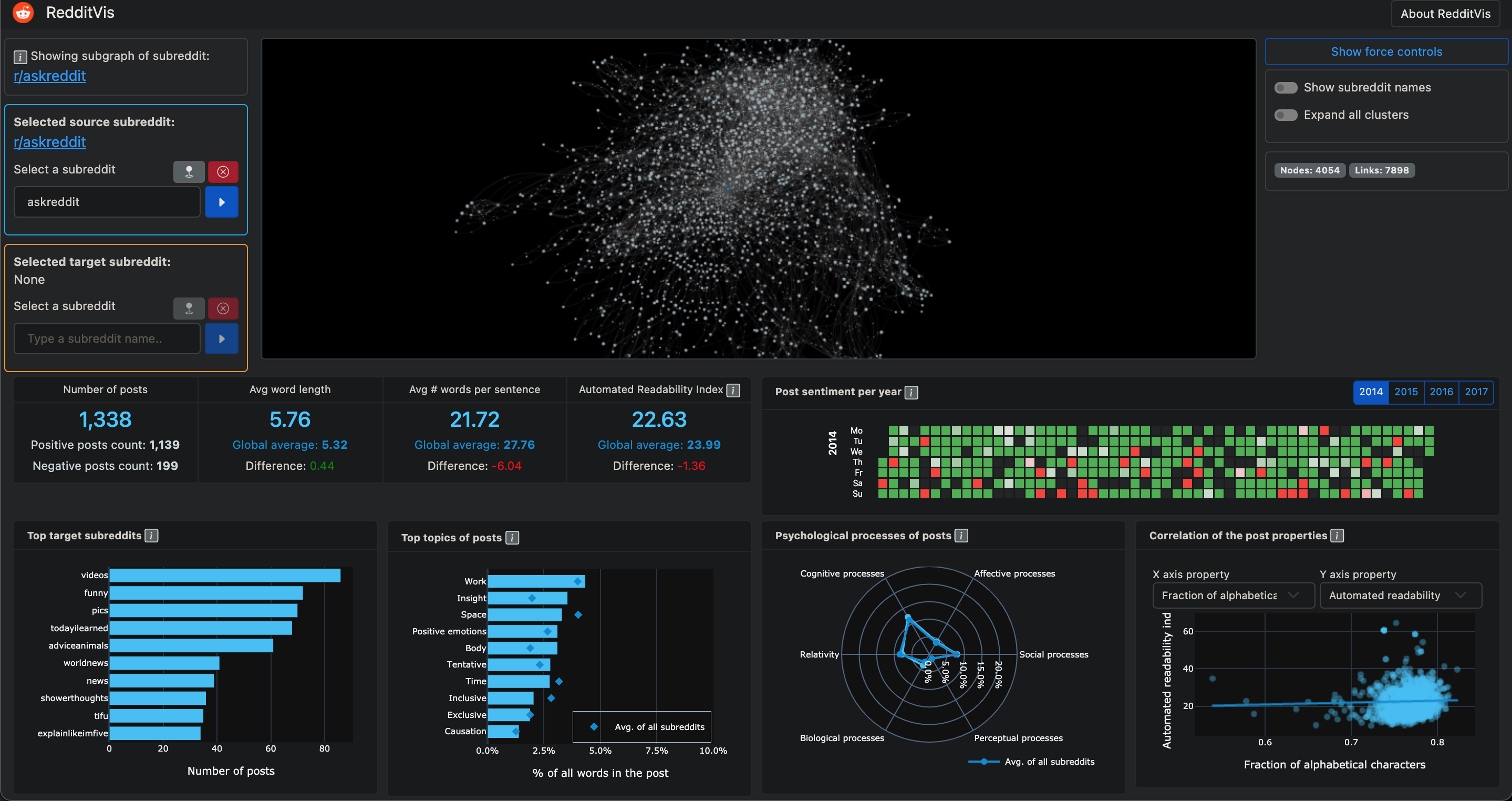 A Visual Analytics dashboard for gaining insights into the Social Network: Reddit Hyperlink Network data set.