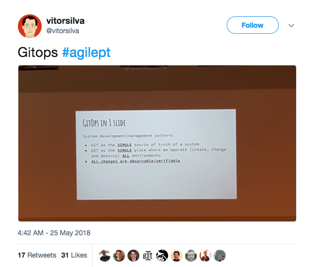 A path towards a developer centric experience for managing applications. We’re applying the Git workflow to operations, as well as development. Note that this is not just about Git push, it’s about how we set up the entire CICD toolchain and UI/UX.