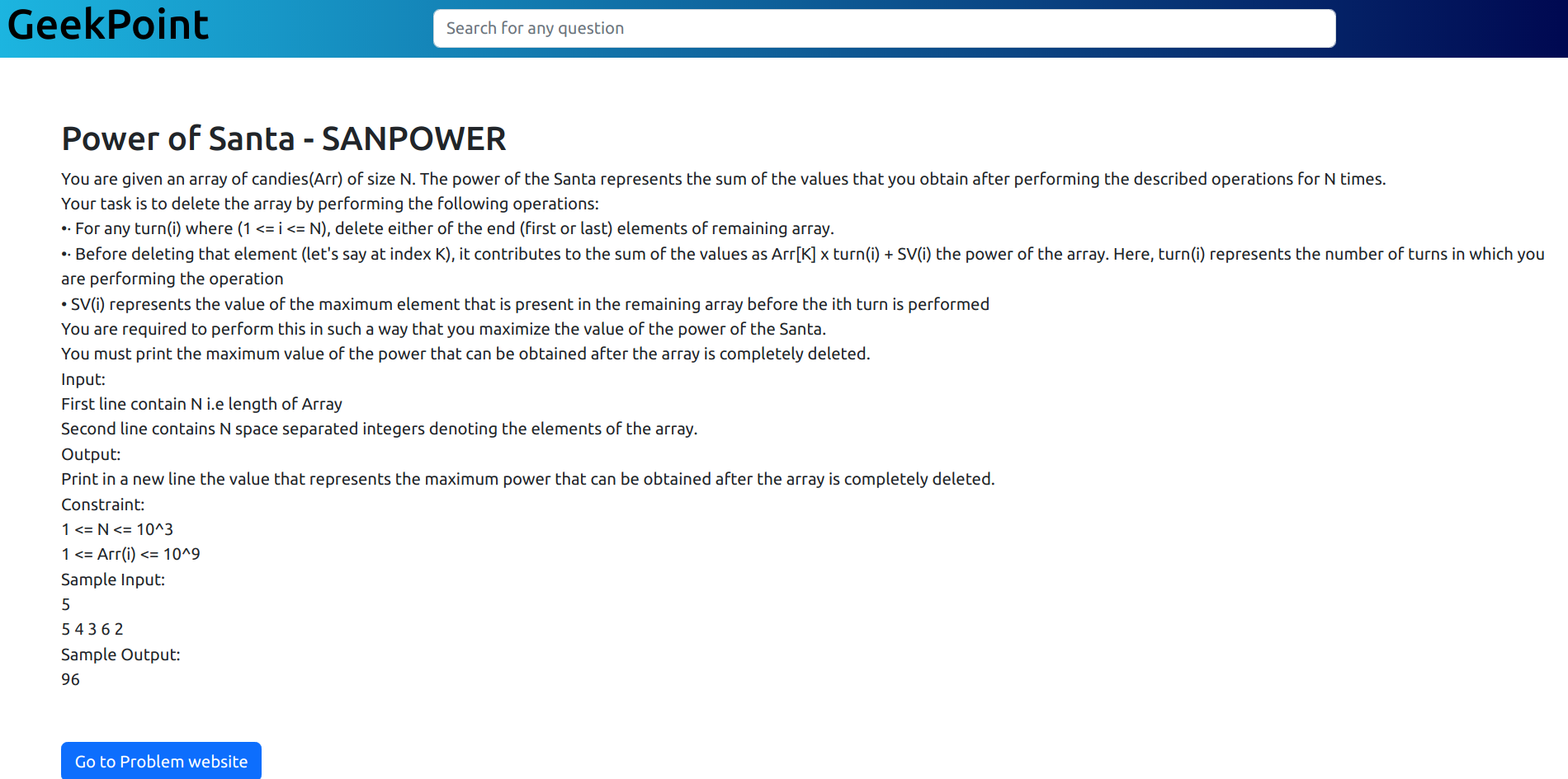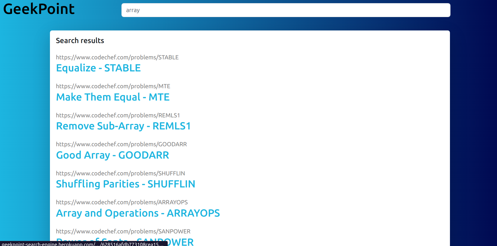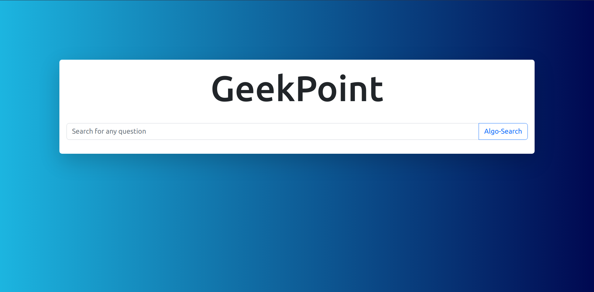 GeekPoint is a search engine designed specifally to search DSA (data structures and algorithms) problems across various CP platforms. It has a nice user experience and it finds search results in few seconds. The search engine uses BM 25 similarity function to estimate the relevance of documents in database to the given search query. The search engine is run by a Node.js + Express server. The frontend is written using HTML, BootStrap CSS and EJS. The database is created by scrapping web using Beautiful Soup and Selenium in python and is stored in MongoDB.