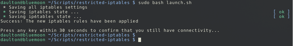 - To restore your old rules launch restore-iptables.sh as such and follow the prompts