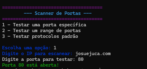 Este é um Scanner de Portas desenvolvido em Python. Ele permite verificar se portas específicas de um endereço IP estão abertas, testar um intervalo de portas e escanear portas associadas a protocolos comuns. O script exibe informações sobre o progresso do escaneamento e melhora a visualização com cores.