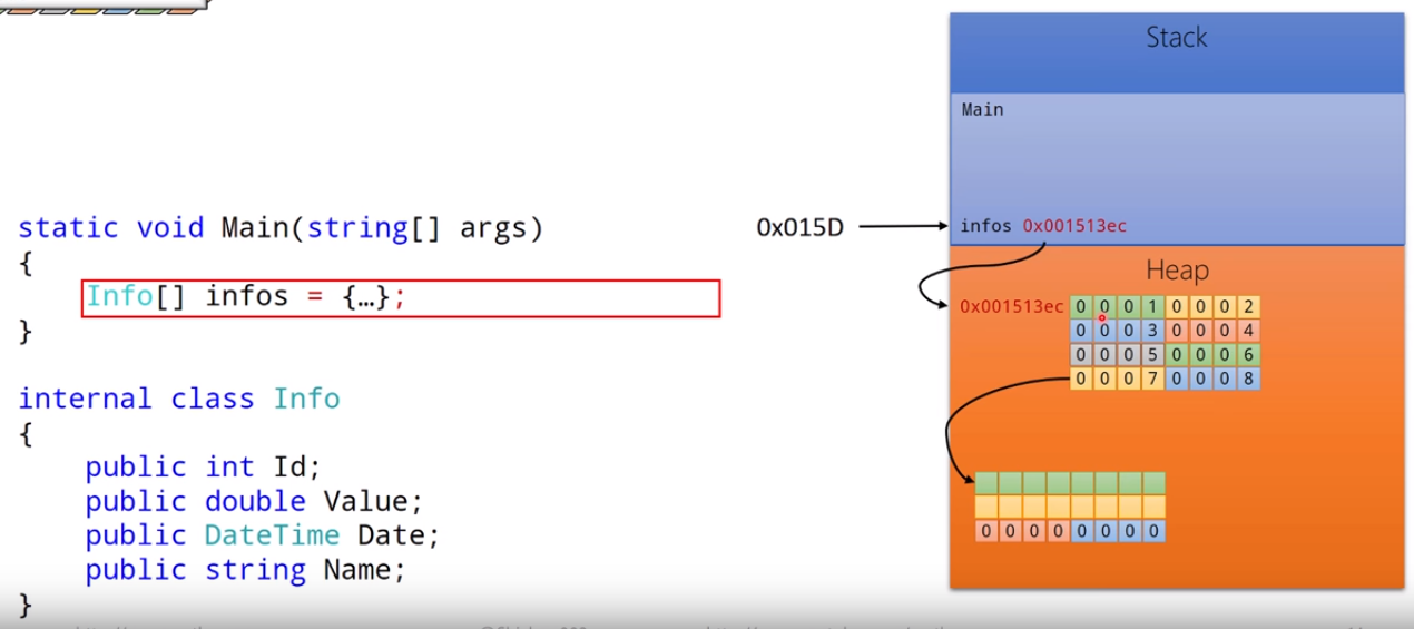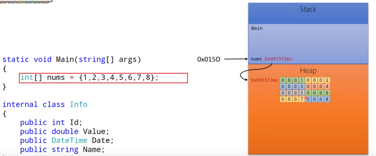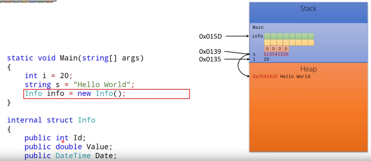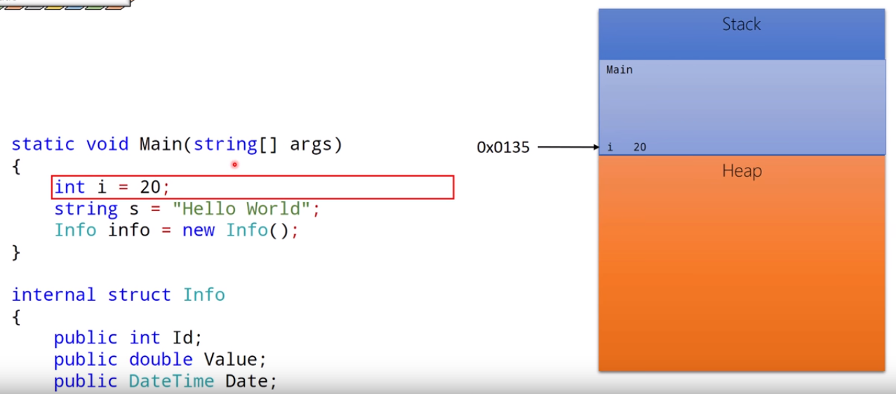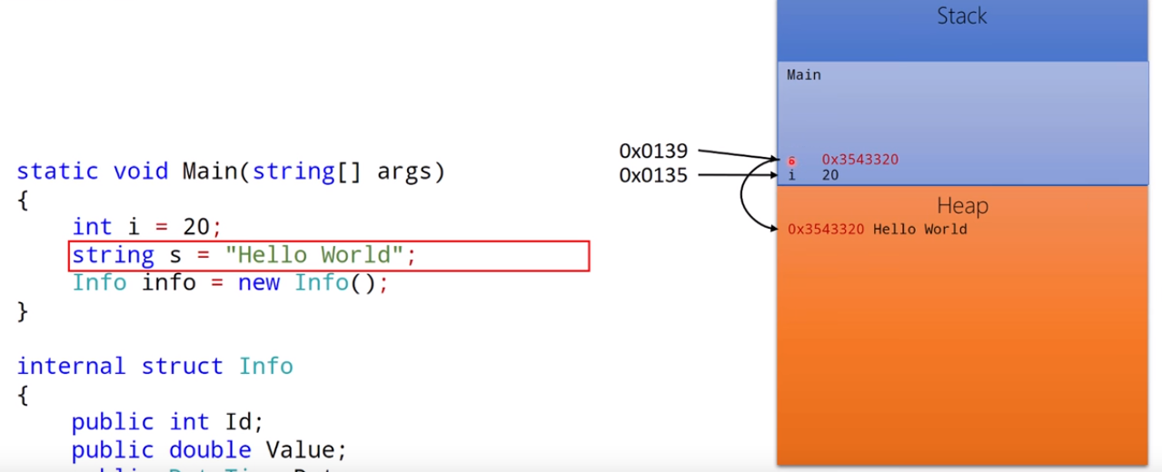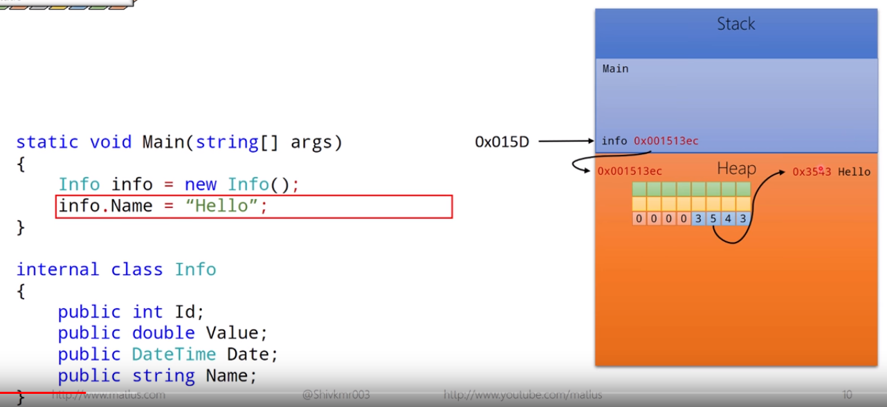 var o = new object();is that o is our object, and this is not true it is acceptable - but we want to be more specific. We need to differentiate between the object and the reference, the object is on the right side of the equation,var ois the reference pointing to that object. Objects are allocated in the heap andopoints to the object.