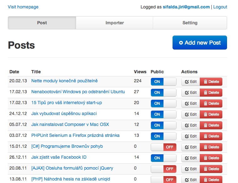 - Posts management (create, edit, delete, count of views)