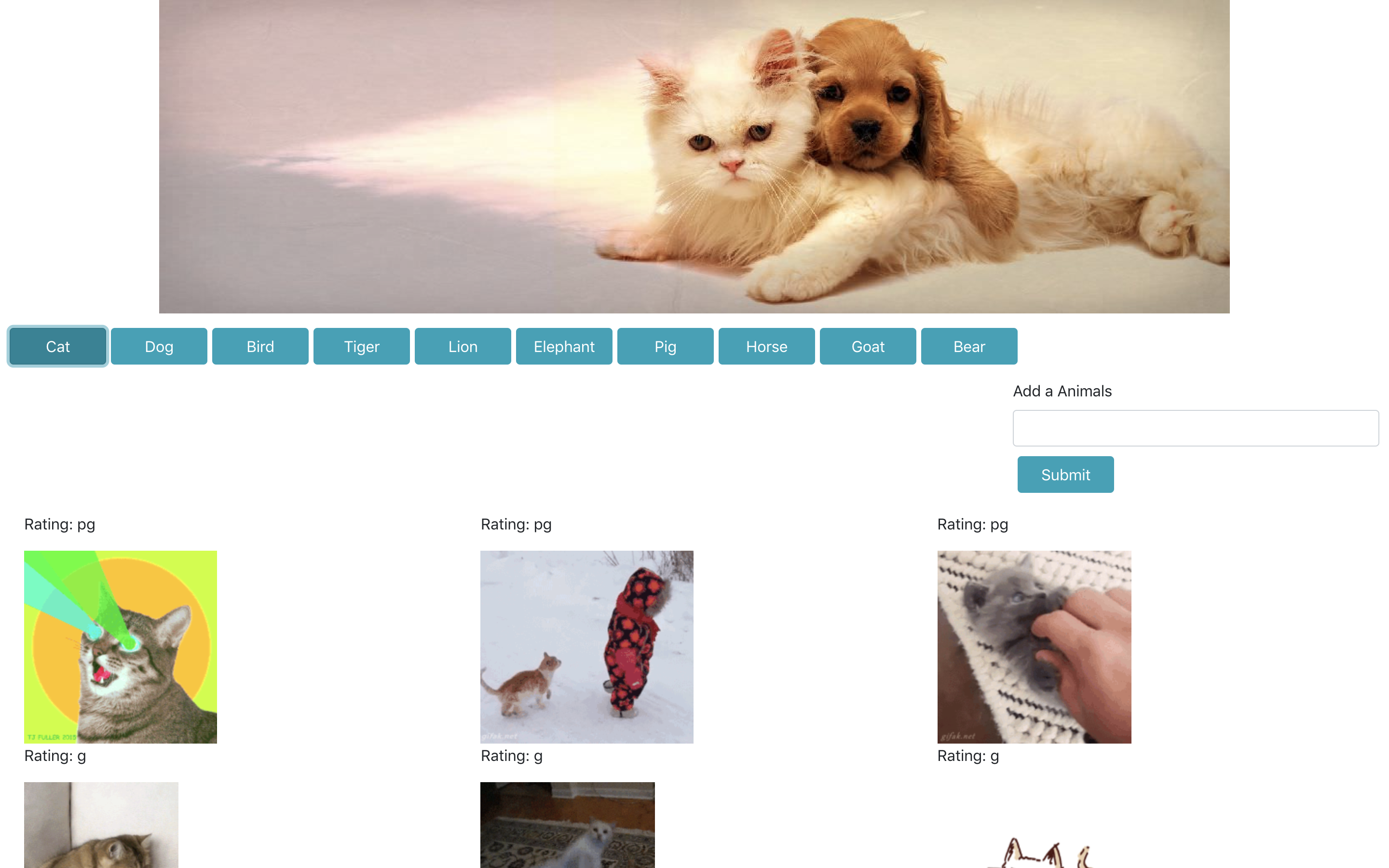 This app displays buttons related to a certain topic and allows you to add search terms to generate additional buttons that when clicked, accesses the GIPHY API and generates 10 static GIPHY images.Click on an image to pause or play the GIF.