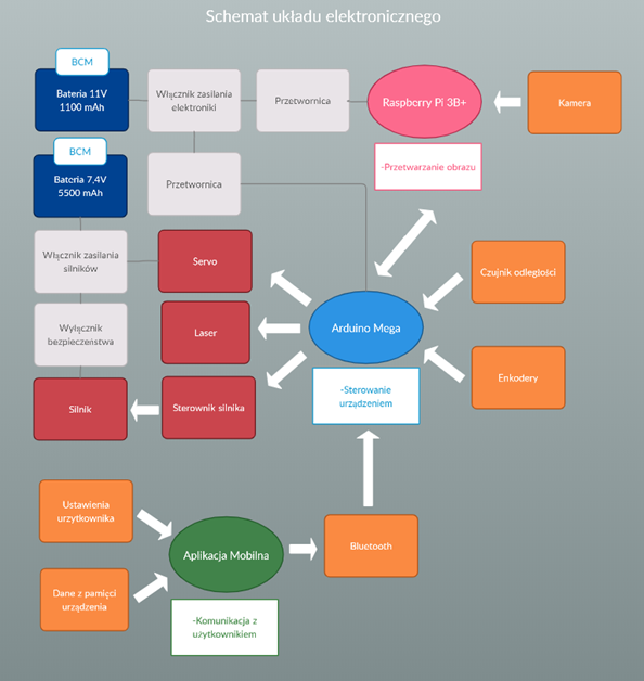 After that operations information is sended to the Arduino. uC recalculates value in pixels into the turning angle of robot. Moreover, Arduino is responsible for: