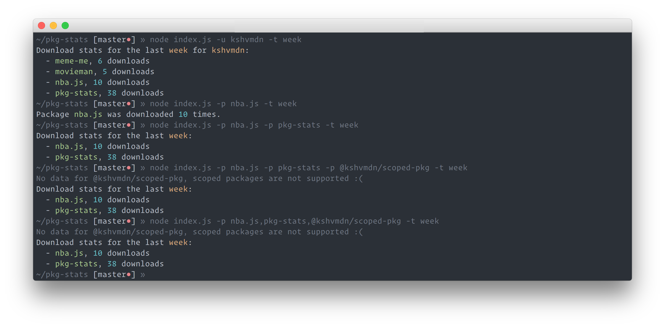 pkgstatsrequires either a username or package name(s) and a period (day/week/month). See below for usage, options, and examples (or runpkgstats --helpto access it in your console).