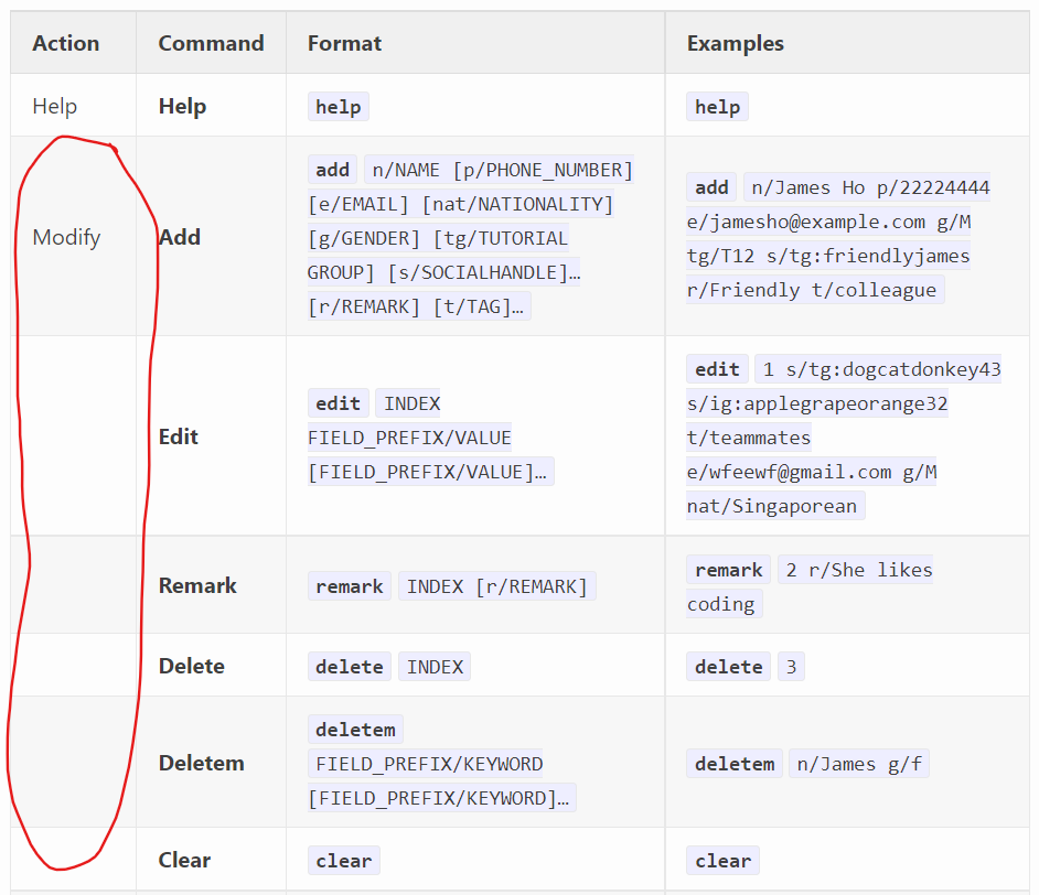 Would be good if there was a way to merge the cells so that you can better show that these commands are grouped by specific functionality. Personally, I thought the table was incomplete for a few seconds until I realised that the first column was stating the categories of the commands.
