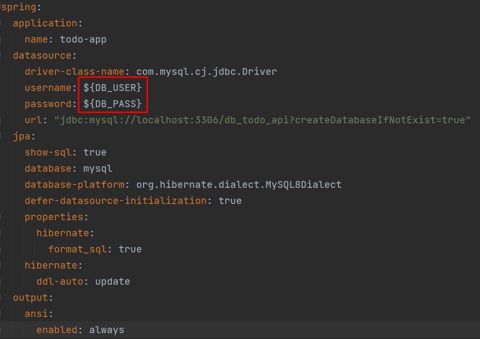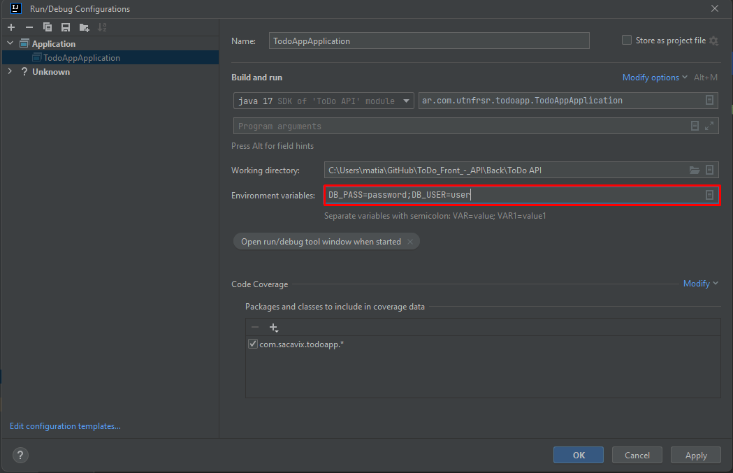 - En la ventana que se abre, en la parte central de la pantalla seleccionar "Environment variables:" agregar las variables de entorno con el nombre de "DB_USER" y "DB_PASSWORD" y el valor correspondiente a cada una.
