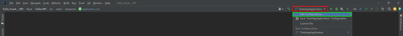 - En la barra superior al lado del martillo verde (build), aparece el nombre del proyecto, hacer click y seleccionar "Edit Configurations..."