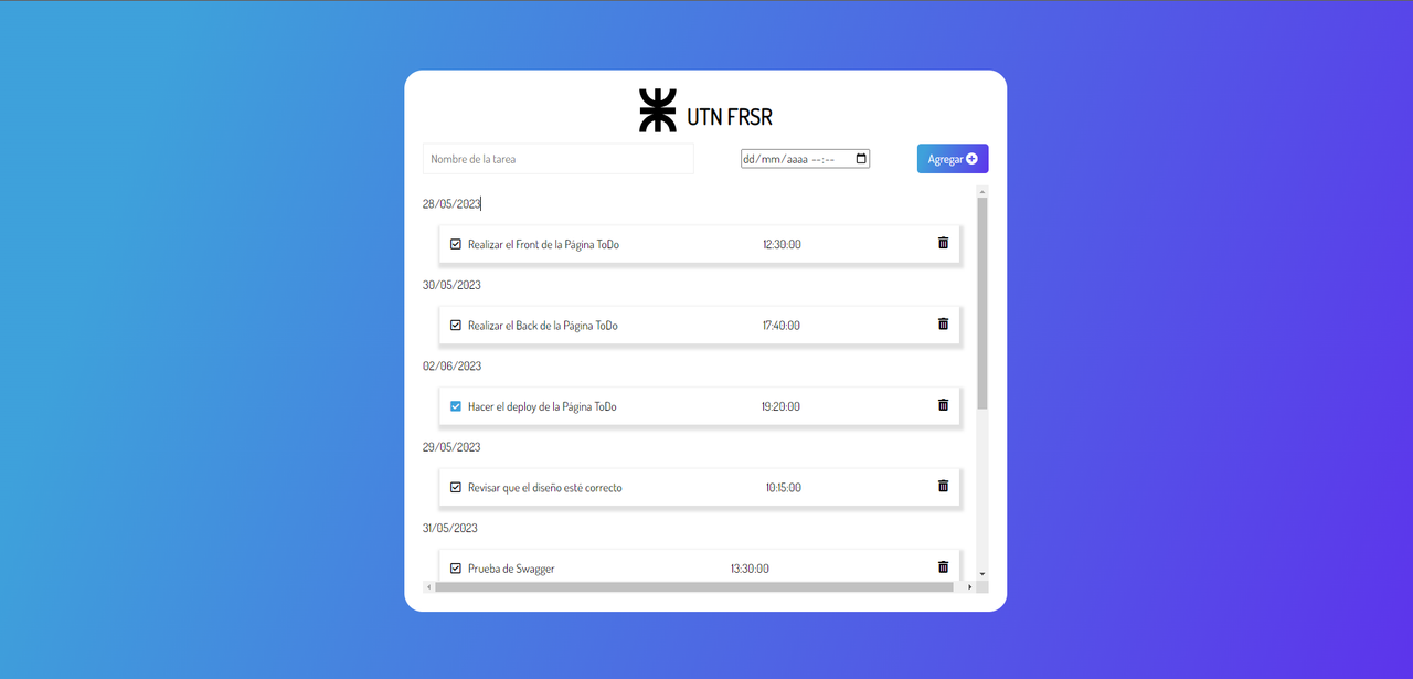 Esta página permite Agregar taréas a realizar, Marcarlas como Realizadas y también Eliminarlas. Almacenandolas en la base de datos y ordenandolas por fecha y horario. Todo esto se realiza mediante la utilización de los endpoints que provee la API. Esto se puede realizarlo mediante funciones en JavaScript, que permite crear elementos, agregar clases y modificarlas e incluso eliminar esos elementos creados dinamicamente.