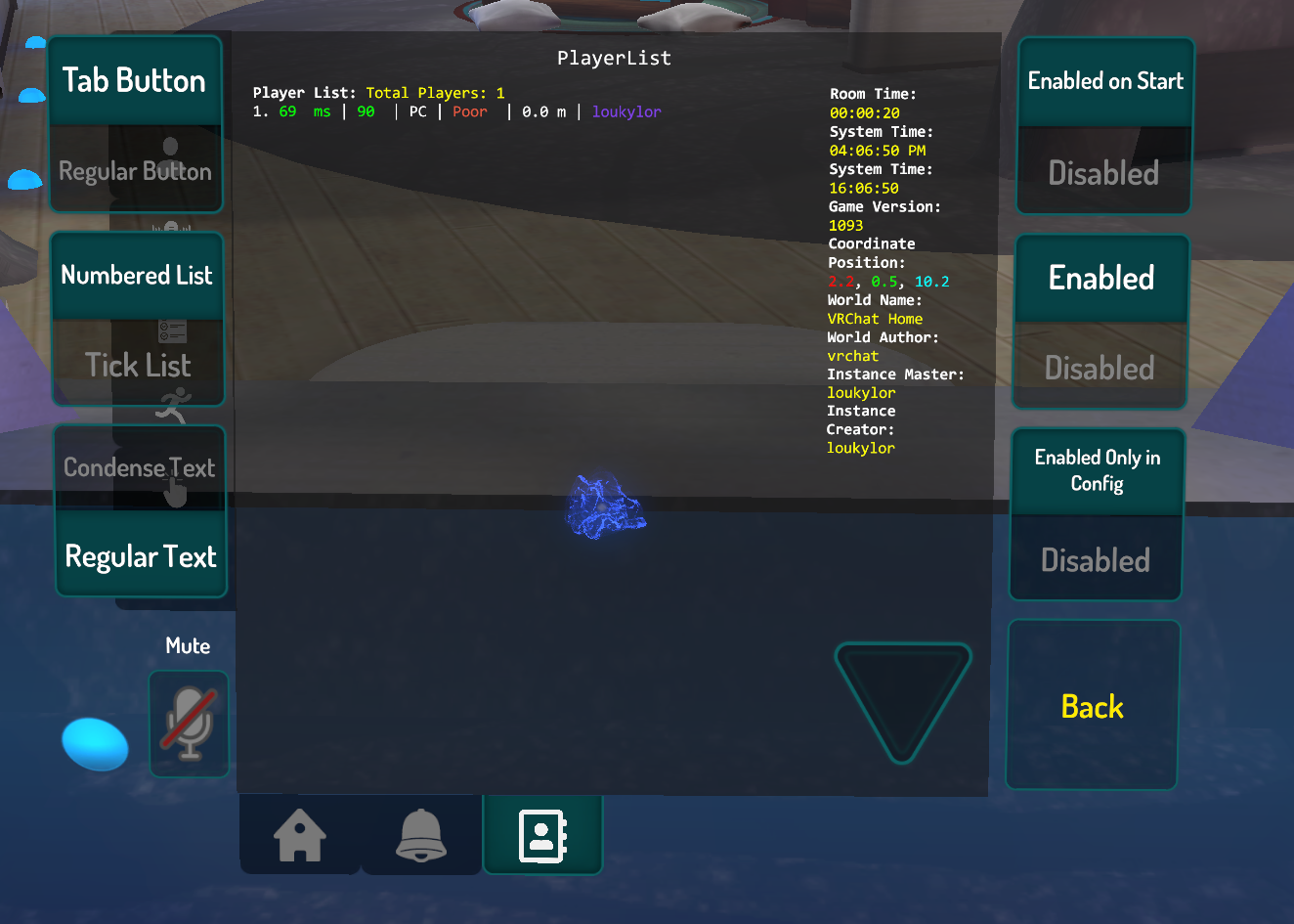 Each entry to the player list is a button that will open the user in the QuickMenu on click. The player's name will be colored to the rank they are (OGTrustRanks compatible!), each entry also has the player's ping, fps, platform, avatar performance, distance from you, and number of owned objects. Note that the number of owned objects will be inaccurate in instances where you're alone and also when you first join an instance. You may also toggle each of these on and off. So, if you don't like how the avatar performance takes up space, you can turn it off.