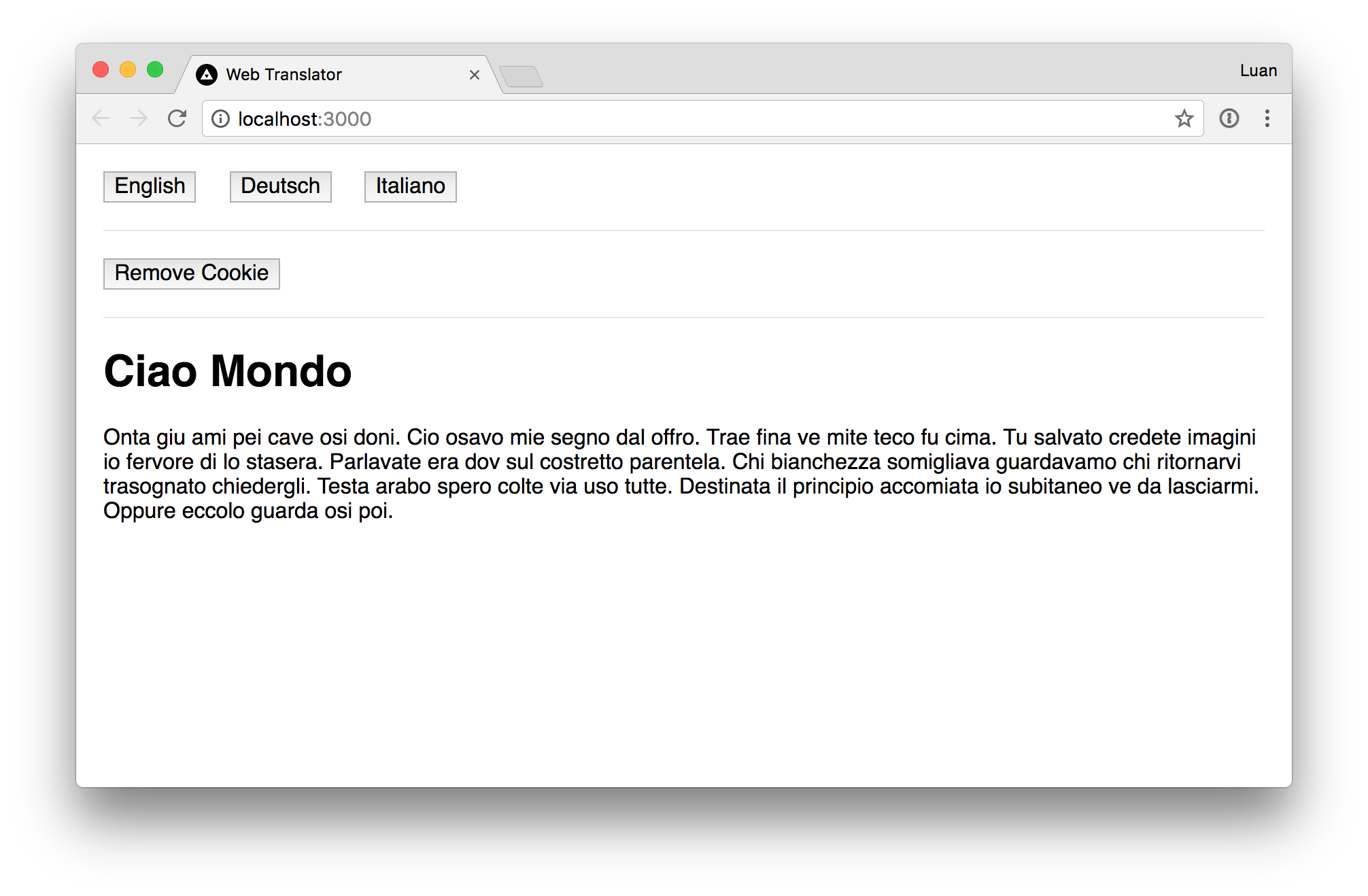 }The translate function looks for all elements in the DOM with the tkey attribute and it replaces the content with the translation corresponding to that key. The translation samples can be found at: src/lang/de.json, src/lang/en.json, src/lang/it.json;
