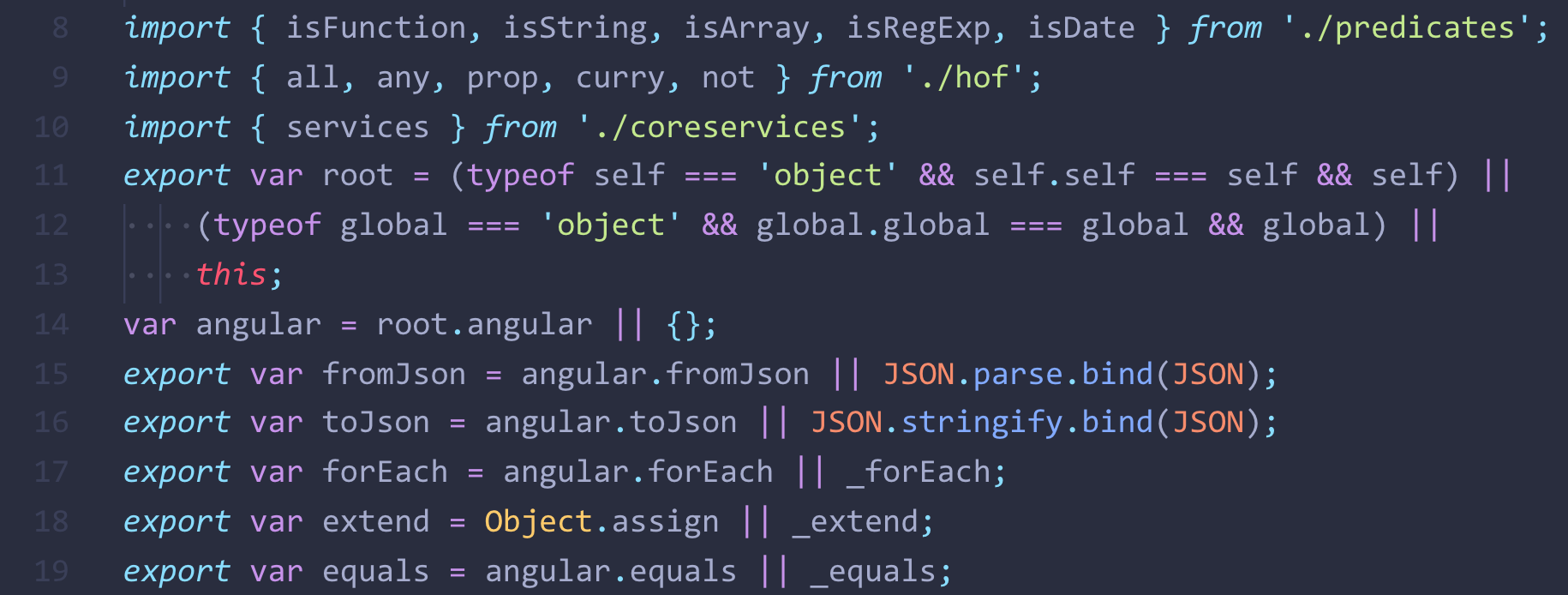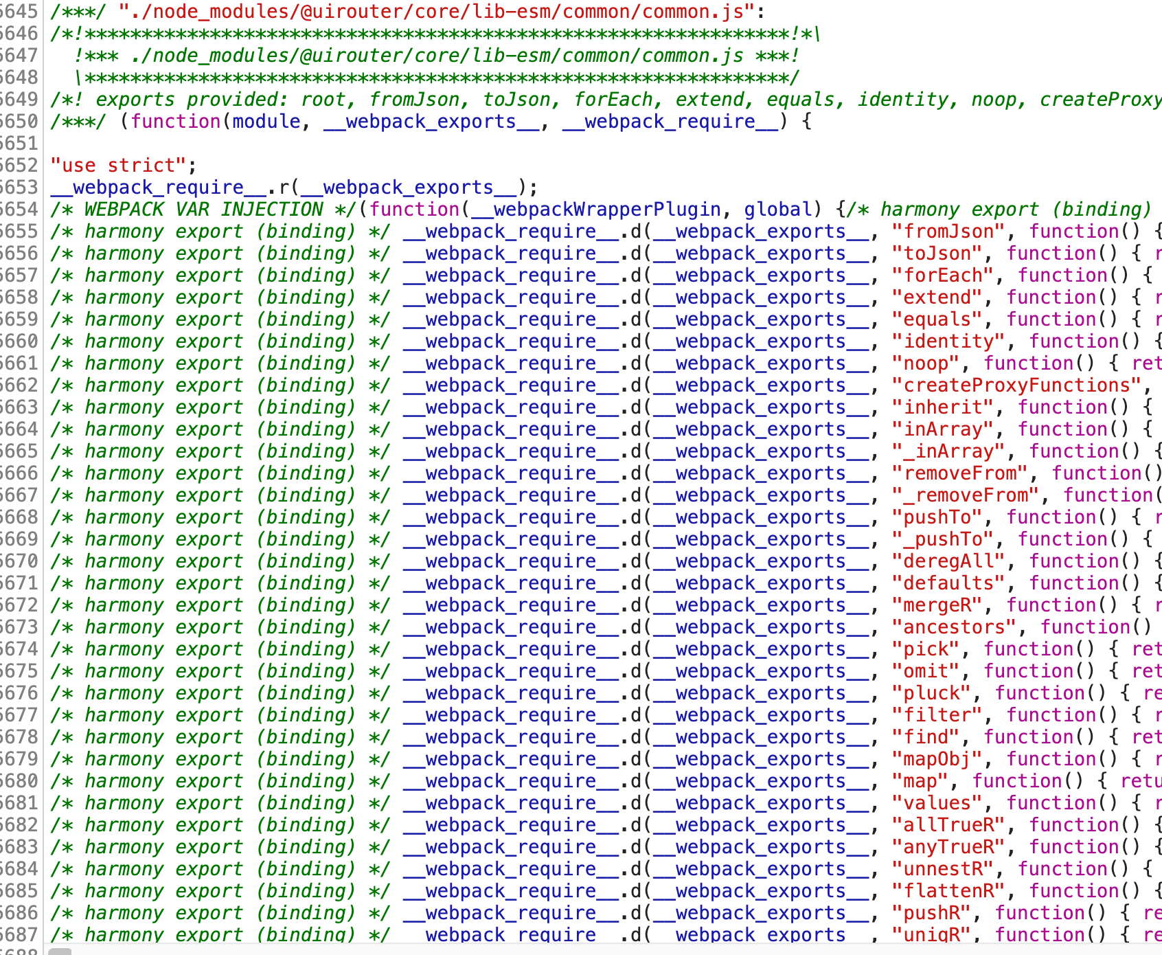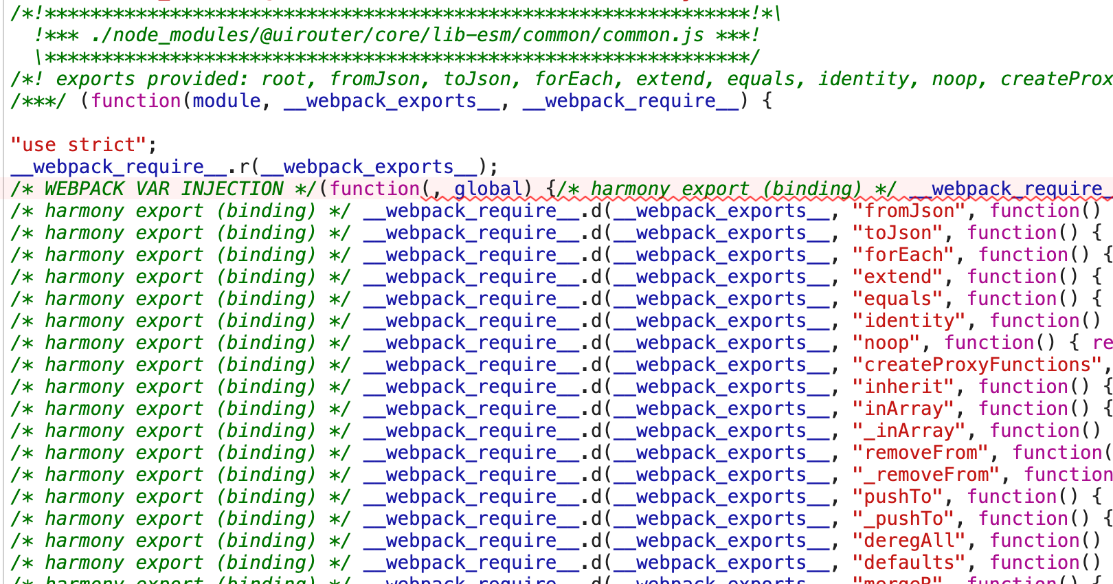 Taking a look at the corresponding JS source from node_modules/@uirouter/core/lib-esm/common/common.js around where the syntax error appears to be, it looks like the function we're wrapping is dealing with these exports: