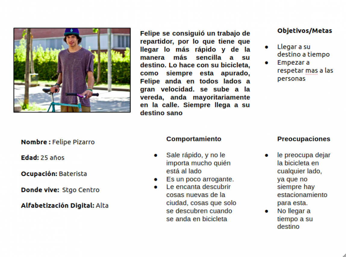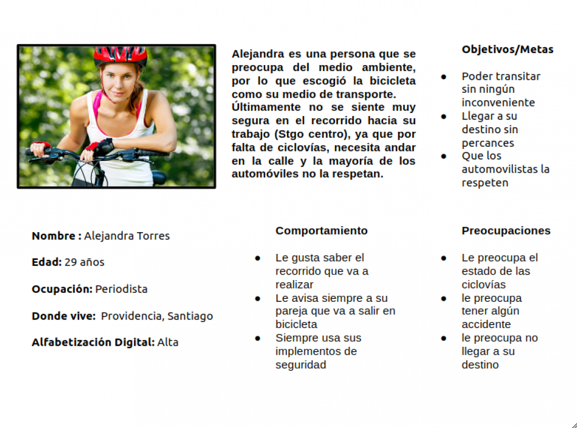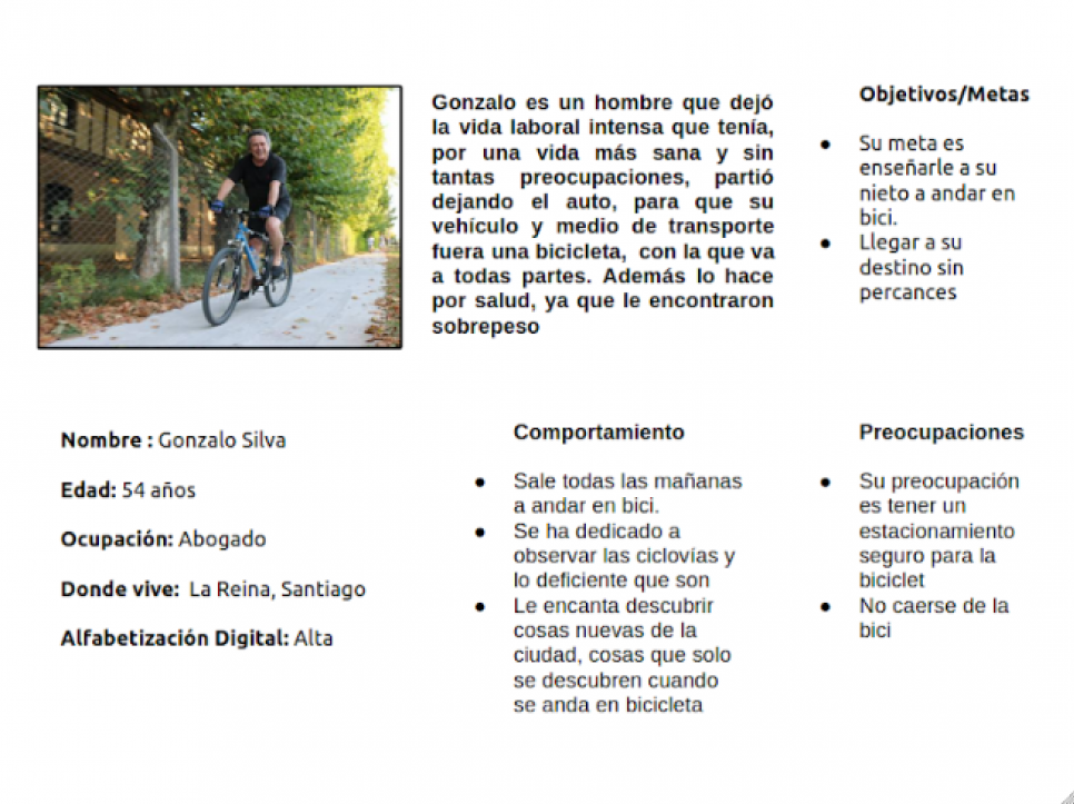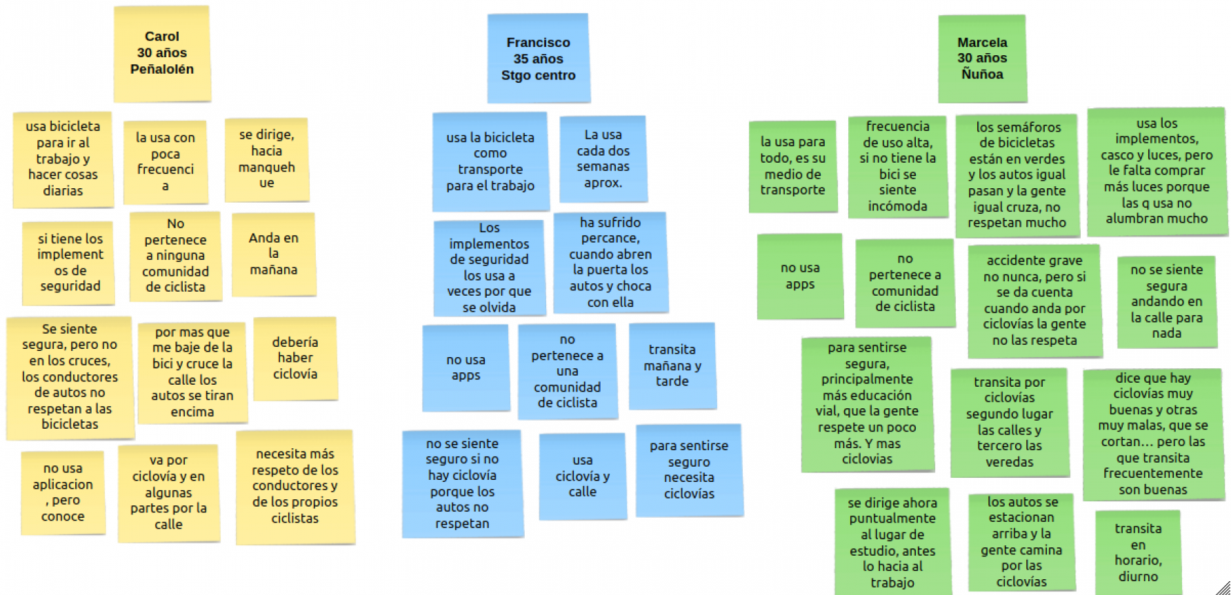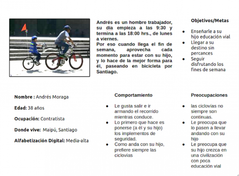 Investigue cuáles eran los puntos con mayor presencia de ciclistas en Santiago, y salí a recopilar información relevante. Después de recorrer las calles, me dí cuenta que unos de los principales problemas era la infraestructura de algunas ciclovías, estas eran muy angostas, sin letreros que les indicaran a los automovilistas que por ahí cruza una ciclovía, estas estaban en lugares altamente peligrosos, etc. Otra cosa que pude ver es que las personas que transitan, lo hacen sobre las ciclovías, vi autos estacionados sobre ellas, paraderos de buses que para acceder a ellos tenían que pasar sobre las ciclovías, etc, así, un sin fin de problemas. Le pregunté a algunos ciclistas que circulaban por el sector, que pensaban sobre todo esto, de todo lo que había visto, y la gran mayoría apuntó a la falta de educación vial que hay en las personas y de los mismos ciclistas que no se respetan entre ellos.