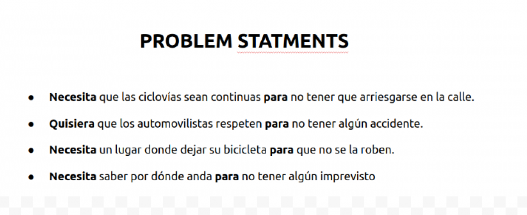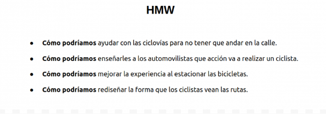 Para saber que experimenta el usuario al momento de andar por la calle en su bicicleta, cuales son sus necesidades, realicé el mapa de empatía, que estudia las variables básicas: lo que ve, lo que dice o hace, lo que escucha y lo que piensa o siente Una vez definida la información, se hace un análisis con otras dos variables: esfuerzo y resultado