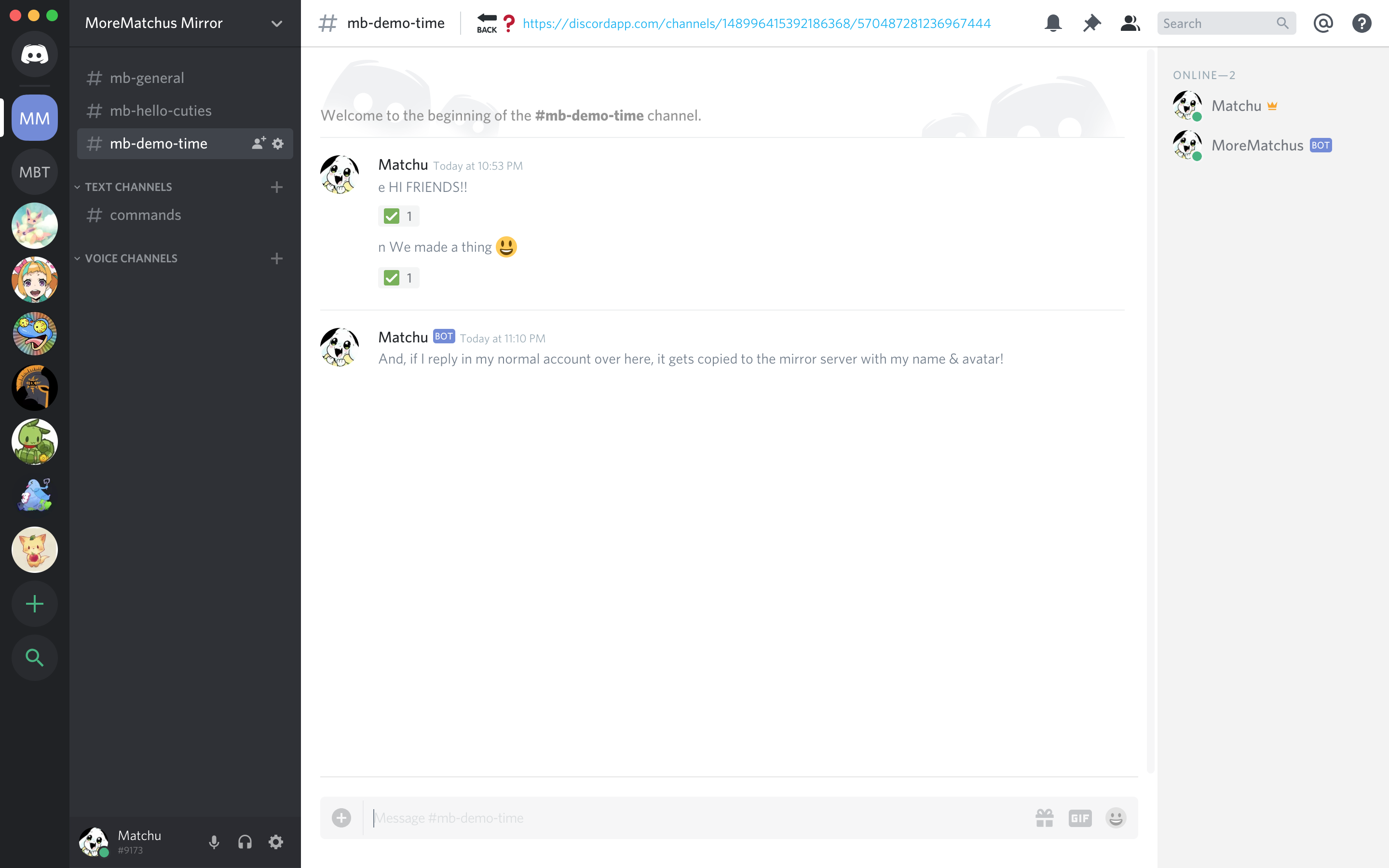 Here's a screenshot of my "mirror server", my personal command center 😊 I want to talk in the #demo-time channel of "Matchu Bots", so I open the #mb-demo-time channel in my mirror server.